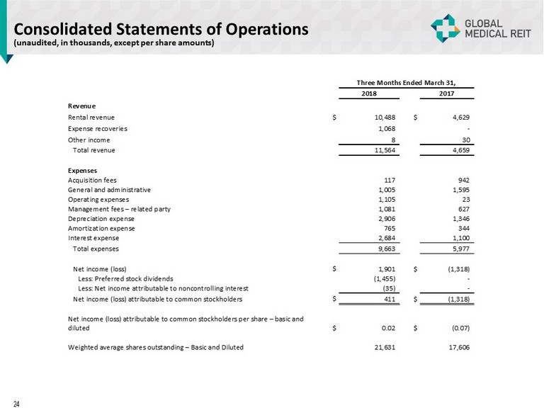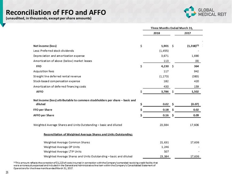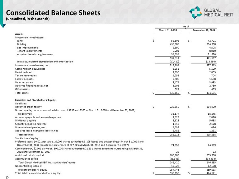 Consolidated Balance Sheets (unaudited, in thousands) 25 As of March 31, 2018 December 31, 2017 Assets Investment in real estate: Land $ 52,301 $ 42,701 Building 436,185 384,338 Site improvements 5,590 4,808 Tenant improvements 9,201 8,010 Acquired lease intangible assets 34,034 31,650 537,311 471,507 Less: accumulated depreciation and amortization (17,420) (13,594) Investment in real estate, net 519,891 457,913 Cash and cash equivalents 3,351 5,109 Restricted cash 4,050 2,005 Tenant receivables 1,253 704 Escrow deposits 2,508 1,638 Deferred assets 5,171 3,993 Deferred financing costs, net 3,105 2,750 Other assets 527 459 Total assets $ 539,856 $ 474,571 Liabilities and Stockholders’ Equity Liabilities: Revolving credit facility $ 229,150 $ 164,900 Notes payable, net of unamortized discount of $898 and $930 at March 31, 2018 and December 31, 2017, respectively 38,577 38,545 Accounts payable and accrued expenses 4,125 2,020 Dividends payable 5,826 5,638 Security deposits and other 4,912 2,128 Due to related parties, net 1,035 1,036 Acquired lease intangible liability, net 1,488 1,291 Total liabilities 285,113 215,558 Stockholders' equity: Preferred stock, $0.001 par value, 10,000 shares authorized; 3,105 issued and outstanding at March 31, 2018 and December 31, 2017 (liquidation preference of $77,625 at March 31, 2018 and December 31, 2017) 74,959 74,959 Common stock, $0.001 par value, 500,000 shares authorized; 21,631 shares issued and outstanding at March 31, 2018 and December 31, 2017 22 22 Additional paid-in capital 205,788 205,788 Accumulated deficit (38,349) (34,434) Total Global Medical REIT Inc. stockholders' equity 242,420 246,335 Noncontrolling interest 12,323 12,678 Total stockholders’ equity 254,743 259,013 Total liabilities and stockholders' equity $ 539,856 $ 474,571