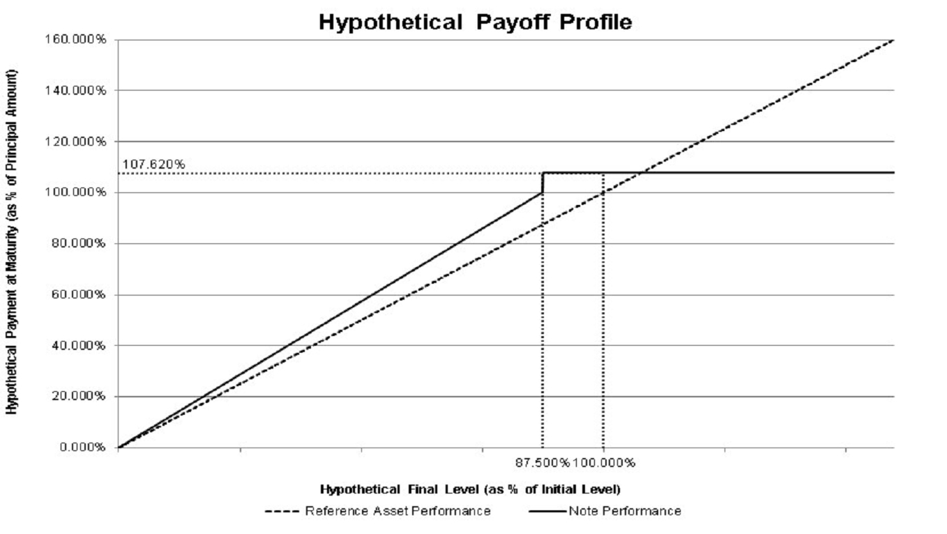 is greater than or equal to the threshold level of 87.50% of the initial level (equal to the closing level of the index on the pricing date), you will receive the threshold settlement amount of between $1,076.20 and $1,089.30 (to be determined on