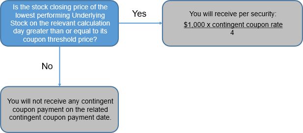 On each contingent coupon payment date, you will receive a contingent coupon payment at a per annum rate equal to the contingent coupon rate if, and only if, the stock closing price of the lowest performing Underlying Stock on the related calculation day is greater than or equal to its coupon threshold price. Each “contingent coupon payment,” if any, will be