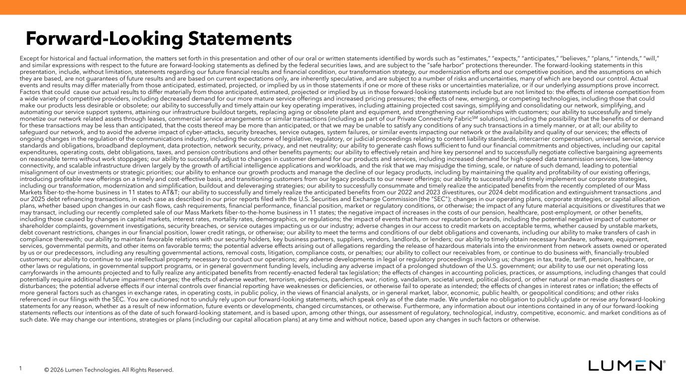 “The combination of a solid fourth quarter and the close of the AT&T transaction marks a defining moment for Lumen and strengthens our foundation for growth,” said Lumen CEO Kate Johnson. “We’re emerging as a simpler, more focused enterprise company with a stronger balance sheet and greater flexibility to invest in our strategy to modernize the physical network, scale our digital platform, and help customers move data quickly, securely, and effortlessly to thrive in the AI era. This is how we create value for our customers and shareholders.”