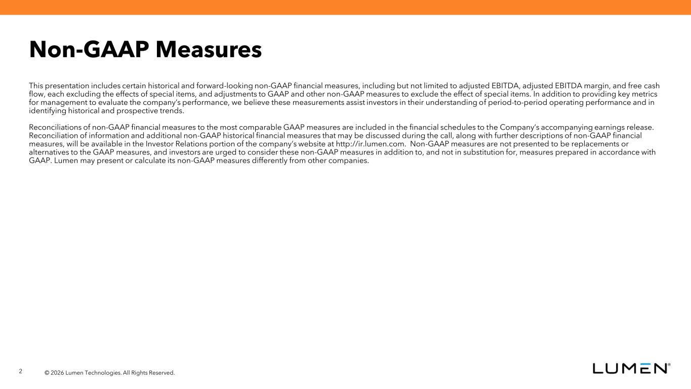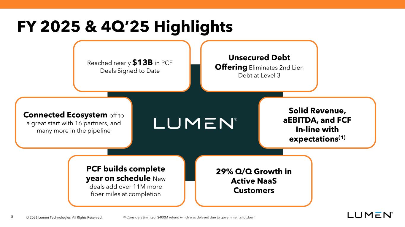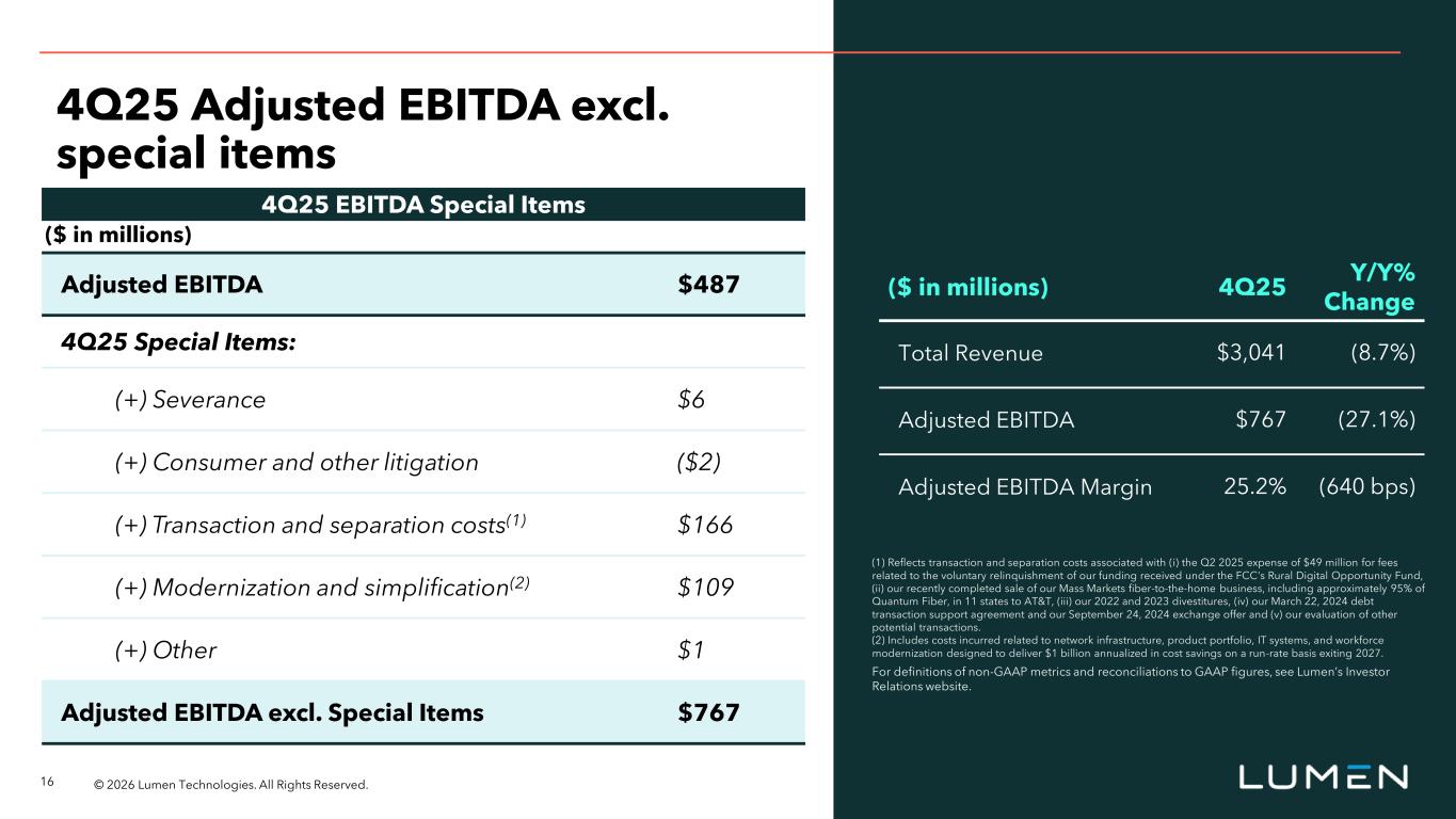 DENVER, Feb. 3, 2026 — Lumen Technologies (NYSE: LUMN) reported results for the fourth quarter and full year ended Dec. 31, 2025.