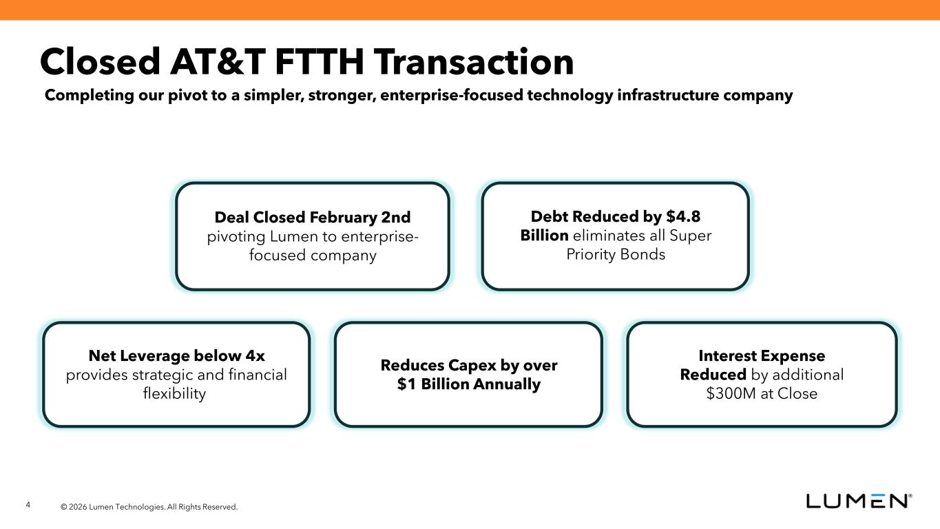 Lumen Technologies Reports Solid Fourth Quarter and Full Year 2025 Results; Completes AT&T Transaction, Strengthening Balance Sheet and Advancing Enterprise Focus