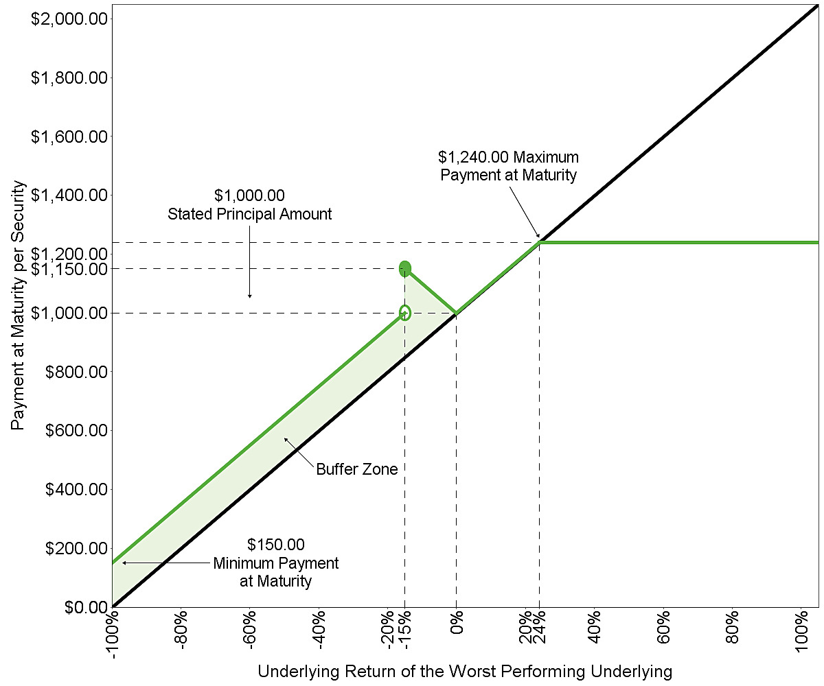 You may lose a significant portion of your investment. Unlike conventional debt securities, the securities do not repay a fixed amount of principal at maturity. Instead, your payment at maturity will depend on the performance of the worst performing underlying. If the worst performing underlying depreciates by more than the buffer percentage from its initial underlying value to its final underlying value, you will lose 1% of the stated principal amount of your securities for every 1% by which that depreciation exceeds the buffer percentage.