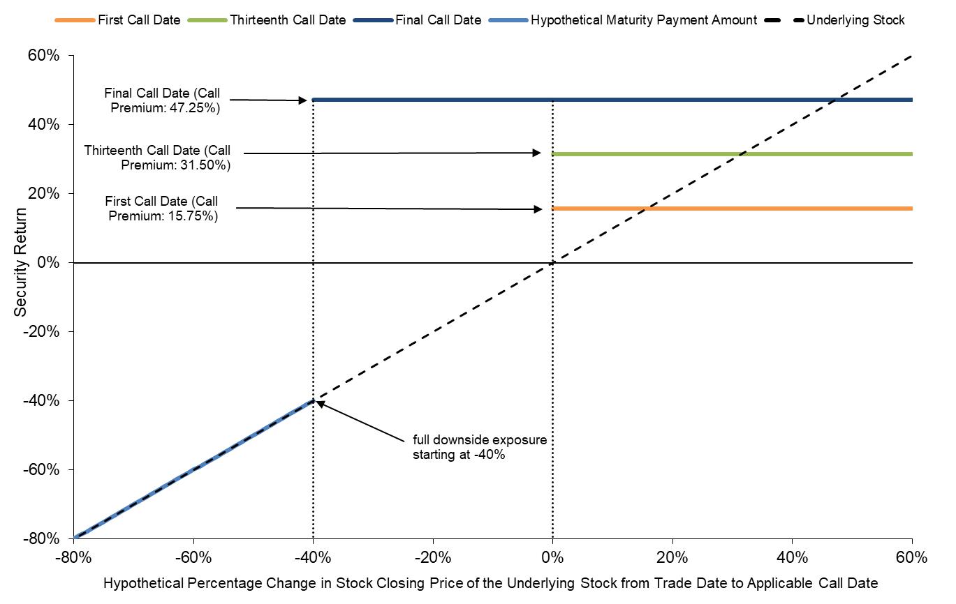 | Automatic Call: | If the stock closing price of the Underlying Stock on any call date is greater than or equal to the applicable call value, the securities will be automatically called for the principal amount plus the call premium applicable to that call date. See “Call Dates and Call Premiums” on page 2. |