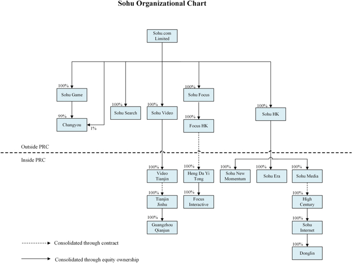 | • | “we,” “us,” “our,” “our company,” “our Group,” the “Sohu Group,” the “Group,” and “Sohu” refer to Sohu.com Limited (or our predecessor Sohu.com Inc., as applicable) and, unless the context requires otherwise, include its subsidiaries and variable interest entities (“VIEs”). As described elsewhere in this annual report, we do not own the VIEs, and the results of the VIEs’ operations only accrue to us through contractual arrangements between the VIEs, and the VIEs’ nominee shareholders, and certain of our subsidiaries. Accordingly, in appropriate contexts we will describe the VIEs’ activities separately from those of our direct and indirect owned subsidiaries and our use of the terms “we,” “us,” and “our” may not include the VIEs in those contexts. Sohu.com Inc., a Delaware corporation, was dissolved on May 31, 2018 and Sohu.com Limited, which before then was a direct wholly-owned subsidiary of Sohu.com Inc., replaced Sohu.com Inc. as the top-tier, publicly-traded holding company of the Sohu Group. See “Information on the Company-History and Development of the Company” in Item 4 of this annual report. |
