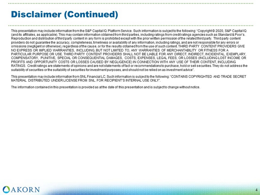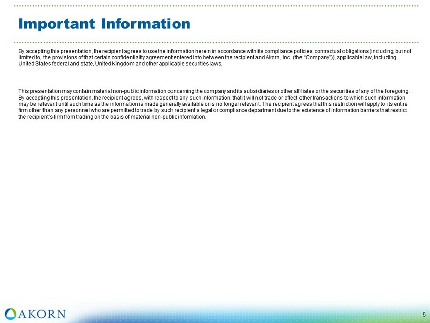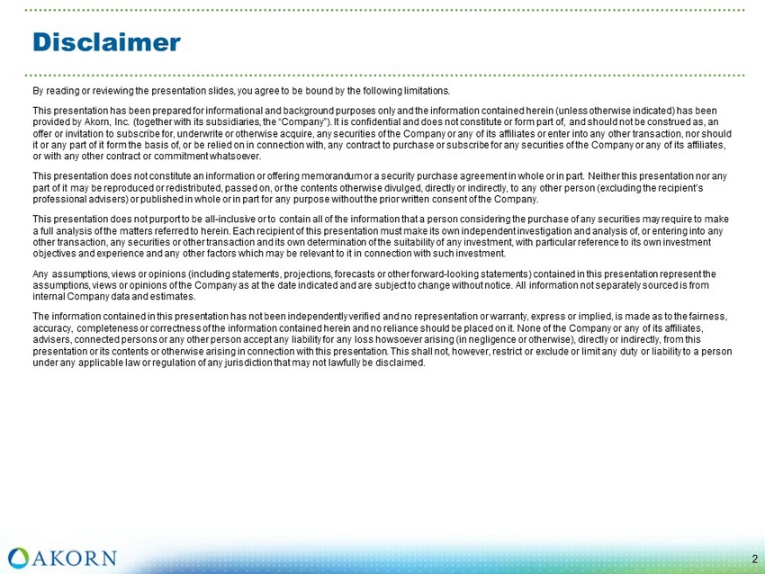 Disclaimer By reading or reviewing the presentation slides, you agree to be bound by the following limitations. This presentation has been prepared for informational and background purposes only and the information contained herein (unle ss otherwise indicated) has been provided by Akorn, Inc. (together with its subsidiaries, the “Company”). It is confidential and does not constitute or form p art of, and should not be construed as, an offer or invitation to subscribe for, underwrite or otherwise acquire, any securities of the Company or any of its affiliates or enter into any other transaction, nor should it or any part of it form the basis of, or be relied on in connection with, any contract to purchase or subscribe for any sec uri ties of the Company or any of its affiliates, or with any other contract or commitment whatsoever. This presentation does not constitute an information or offering memorandum or a security purchase agreement in whole or in p art . Neither this presentation nor any part of it may be reproduced or redistributed, passed on, or the contents otherwise divulged, directly or indirectly, to any oth er person (excluding the recipient’s professional advisers) or published in whole or in part for any purpose without the prior written consent of the Company. This presentation does not purport to be all - inclusive or to contain all of the information that a person considering the purcha se of any securities may require to make a full analysis of the matters referred to herein. Each recipient of this presentation must make its own independent investig ati on and analysis of, or entering into any other transaction, any securities or other transaction and its own determination of the suitability of any investment, with p art icular reference to its own investment objectives and experience and any other factors which may be relevant to it in connection with such investment. Any assumptions, views or opinions (including statements, projections, forecasts or other forward - looking statements) contained in this presentation represent the assumptions, views or opinions of the Company as at the date indicated and are subject to change without notice. All informat ion not separately sourced is from internal Company data and estimates. The information contained in this presentation has not been independently verified and no representation or warranty, express or implied, is made as to the fairness, accuracy, completeness or correctness of the information contained herein and no reliance should be placed on it. None of the Co mpany or any of its affiliates, advisers, connected persons or any other person accept any liability for any loss howsoever arising (in negligence or otherwi se) , directly or indirectly, from this presentation or its contents or otherwise arising in connection with this presentation. This shall not, however, restrict or exc lude or limit any duty or liability to a person under any applicable law or regulation of any jurisdiction that may not lawfully be disclaimed. 2