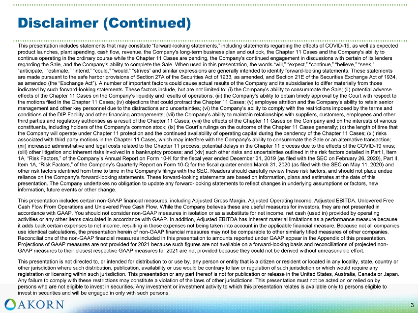 Disclaimer (Continued) This presentation includes statements that may constitute “forward - looking statements,” including statements regarding the effects of COVID - 19, as well as expected product launches, plant spending, cash flow, revenue, the Company's long - term business plan and outlook, the Chapter 11 Cases an d the Company's ability to continue operating in the ordinary course while the Chapter 11 Cases are pending, the Company's continued engagement in discu ssi ons with certain of its lenders regarding the Sale, and the Company's ability to complete the Sale . When used in this presentation, the words “will,” “expect,” “continue,” “believe,” “seek,” “anticipate,” “estimate,” “intend,” “could,” “would,” “strives” and similar expressions are generally intended to identify fo rwa rd - looking statements. These statements are made pursuant to the safe harbor provisions of Section 27A of the Securities Act of 1933, as amended, and Section 21E of the Securities Exchange Act of 1934, as amended (the “Exchange Act”). A number of important factors could cause actual results of the Company and its subsidiaries to differ materially from those indicated by such forward - looking statements. These factors include, but are not limited to: ( i ) the Company’s ability to consummate the Sale; (ii) potential adverse effects of the Chapter 11 Cases on the Company’s liquidity and results of operations; (iii) the Company’s ability to obtain t ime ly approval by the Court with respect to the motions filed in the Chapter 11 Cases; (iv) objections that could protract the Chapter 11 Cases; (v) employee attrition a nd the Company’s ability to retain senior management and other key personnel due to the distractions and uncertainties; (vi) the Company’s ability to comply with the r est rictions imposed by the terms and conditions of the DIP Facility and other financing arrangements; (vii) the Company’s ability to maintain relationships with s upp liers, customers, employees and other third parties and regulatory authorities as a result of the Chapter 11 Cases; (viii) the effects of the Chapter 11 Cases on t he Company and on the interests of various constituents, including holders of the Company’s common stock; (ix) the Court’s rulings on the outcome of the Chapter 11 Case s g enerally; (x) the length of time that the Company will operate under Chapter 11 protection and the continued availability of operating capital during the pendency of the Chapter 11 Cases; (xi) risks associated with third party motions in the Chapter 11 Cases, which may interfere with the Company’s ability to consummate the Sa le or an alternative transaction; (xii) increased administrative and legal costs related to the Chapter 11 process; potential delays in the Chapter 11 process due to the effects of the COVID - 19 virus; (xiii) other litigation and inherent risks involved in a bankruptcy process; and (xiv) such other risks and uncertainties out lin ed in the risk factors detailed in Part I, Item 1A, “Risk Factors,” of the Company’s Annual Report on Form 10 - K for the fiscal year ended December 31, 2019 (as filed with the S EC on February 26, 2020), Part II, Item 1A, “Risk Factors,” of the Company’s Quarterly Report on Form 10 - Q for the fiscal quarter ended March 31, 2020 (as filed wi th the SEC on May 11, 2020) and other risk factors identified from time to time in the Company’s filings with the SEC. Readers should carefully review these risk factors, and should not place undue reliance on the Company’s forward - looking statements. These forward - looking statements are based on information, plans and estim ates at the date of this presentation. The Company undertakes no obligation to update any forward - looking statements to reflect changes in underlying ass umptions or factors, new information, future events or other change. This presentation includes certain non - GAAP financial measures, including Adjusted Gross Margin, Adjusted Operating Income, Adju sted EBITDA, Unlevered Free Cash Flow From Operations and Unlevered Free Cash Flow. While the Company believes these are useful measures for investors, t hey are not presented in accordance with GAAP. You should not consider non - GAAP measures in isolation or as a substitute for net income, net cash (used i n) provided by operating activities or any other items calculated in accordance with GAAP. In addition, Adjusted EBITDA has inherent material limitati ons as a performance measure because it adds back certain expenses to net income, resulting in those expenses not being taken into account in the applicable finan cia l measure. Because not all companies use identical calculations, the presentation herein of non - GAAP financial measures may not be comparable to other similarly titl ed measures of other companies. Reconciliations of the non - GAAP financial measures included in this presentation to amounts reported under GAAP appear in the Ap pendix of this presentation. Projections of GAAP measures are not provided for 2021 because such figures are not available on a forward - looking basis and rec onciliations of projected non - GAAP measures to their closest respective GAAP measures for 2021 are not provided because they could not be derived without u nre asonable effort. This presentation is not directed to, or intended for distribution to or use by, any person or entity that is a citizen or re sid ent or located in any locality, state, country or other jurisdiction where such distribution, publication, availability or use would be contrary to law or regulation of such j uri sdiction or which would require any registration or licensing within such jurisdiction. This presentation or any part thereof is not for publication or release i n t he United States, Australia, Canada or Japan. Any failure to comply with these restrictions may constitute a violation of the laws of other juri