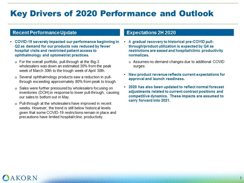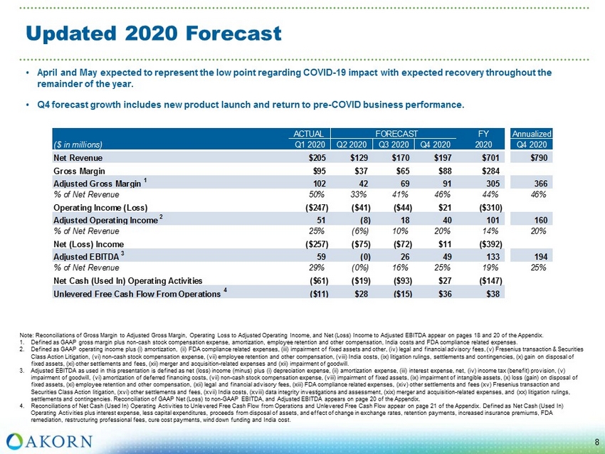 Key Drivers of 2020 Performance and Outlook 7 Recent Performance Update • COVID - 19 severely impacted our performance beginning in Q2 as demand for our products was reduced by fewer hospital visits and restricted patient access to ophthalmology and optometrist practices. o For the overall portfolio, pull - through at the Big - 3 wholesalers was down an estimated 30% from the peak week of March 30th to the trough week of April 30th. o Several ophthalmology products saw a reduction in pull - through exceeding approximately 80% from peak to trough. o Sales were further pressured by wholesalers focusing on inventories (DOH) in response to lower pull - through, causing our sales to bottom out in May. o Pull - through at the wholesalers have improved in recent weeks. However, the trend is still below historical levels given that some COVID - 19 restrictions remain in place and precautions have limited hospital/clinic productivity. • A gradual recovery to historical pre - COVID pull - through/product utilization is expected by Q4 as restrictions are eased and hospital/clinic productivity normalizes. o Assumes no demand changes due to additional COVID surges. • New product revenue reflects current expectations for approval and launch readiness. • 2020 has also been updated to reflect normal forecast adjustments related to current contract positions and competitive dynamics. These impacts are assumed to carry forward into 2021. Expectations 2H 2020