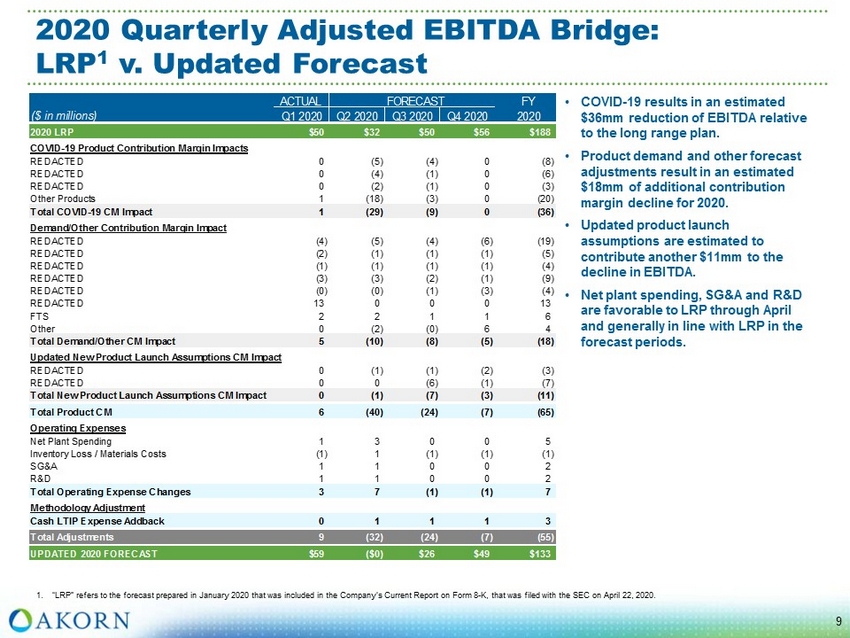 Updated 2020 Forecast • April and May expected to represent the low point regarding COVID - 19 impact with expected recovery throughout the remainder of the year. • Q4 forecast growth includes new product launch and return to pre - COVID business performance. Note: Reconciliations of Gross Margin to Adjusted Gross Margin, Operating Loss to Adjusted Operating Income, and Net (Loss) I nco me to Adjusted EBITDA appear on pages 18 and 20 of the Appendix. 1. Defined as GAAP gross margin plus non - cash stock compensation expense, amortization, employee retention and other compensation, India costs and FDA compliance related expenses. 2. Defined as GAAP operating income plus (i) amortization, (ii) FDA compliance related expenses, (iii) impairment of fixed assets and other, (iv) legal and financial advisory fees, (v) Fres eni us transaction & Securities Class Action Litigation, (vi) non - cash stock compensation expense, (vii) employee retention and other compensation, (viii) India costs, (ix) litigation rulings, settlemen ts and contingencies, (x) gain on disposal of fixed assets, (xi) other settlements and fees, (xii) merger and acquisition - related expenses and (xii) impairment of goodwill. 3. Adjusted EBITDA as used in this presentation is defined as net (loss) income (minus) plus (i) depreciation expense, (ii) amor tiz ation expense, (iii) interest expense, net, (iv) income tax (benefit) provision, (v) impairment of goodwill, (vi) amortization of deferred financing costs, (vii) non - cash stock compensation expense, (viii) impairm ent of fixed assets, (ix) impairment of intangible assets, (x) loss (gain) on disposal of fixed assets, (xi) employee retention and other compensation, (xii) legal and financial advisory fees, (xiii) FDA compliance rel ated expenses, (xiv) other settlements and fees (xv) Fresenius transaction and Securities Class Action litigation, (xvi) other settlements and fees, (xvii) India costs, (xviii) data integrity investigatio ns and assessment, (xix) merger and acquisition - related expenses, and (xx) litigation rulings, settlements and contingencies. Reconciliation of GAAP Net (Loss) to non - GAAP EBITDA, and Adjusted EBITDA appears on page 20 of t he Appendix. 4. Reconciliations of Net Cash (Used In) Operating Activities to Unlevered Free Cash Flow from Operations and Unlevered Free Cas h F low appear on page 21 of the Appendix. Defined as Net Cash (Used In) Operating Activities plus interest expense, less capital expenditures, proceeds from disposal of assets, and effect of change in exchange rates, retention payments, increased insurance premiums, FDA remediation, restructuring professional fees, cure cost payments, wind down funding and India cost. 8 ACTUAL FORECAST FY Annualized ($ in millions) Q1 2020 Q2 2020 Q3 2020 Q4 2020 2020 Q4 2020 Net Revenue $205 $129 $170 $197 $701 $790 Gross Margin $95 $37 $65 $88 $284 Adjusted Gross Margin 1 102 42 69 91 305 366 % of Net Revenue 50% 33% 41% 46% 44% 46% Operating Income (Loss) ($247) ($41) ($44) $21 ($310) Adjusted Operating Income 2 51 (8) 18 40 101 160 % of Net Revenue 25% (6%) 10% 20% 14% 20% Net (Loss) Income ($257) ($75) ($72) $11 ($392) Adjusted EBITDA 3 59 (0) 26 49 133 194 % of Net Revenue 29% (0%) 16% 25% 19% 25% Net Cash (Used In) Operating Activities ($61) ($19) ($93) $27 ($147) Unlevered Free Cash Flow From Operations 4 ($11) $28 ($15) $36 $38
