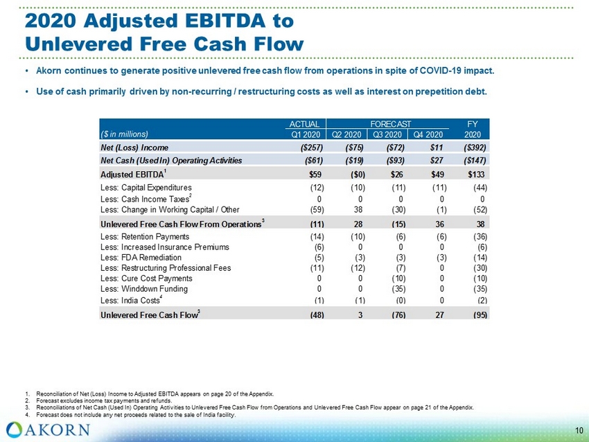 2020 Quarterly Adjusted EBITDA Bridge: LRP 1 v. Updated Forecast 1. “LRP” refers to the forecast prepared in January 2020 that was included in the Company’s Current Report on Form 8 - K, that was fi led with the SEC on April 22, 2020. 9 • COVID - 19 results in an estimated $36mm reduction of EBITDA relative to the long range plan. • Product demand and other forecast adjustments result in an estimated $18mm of additional contribution margin decline for 2020. • Updated product launch assumptions are estimated to contribute another $11mm to the decline in EBITDA. • Net plant spending, SG&A and R&D are favorable to LRP through April and generally in line with LRP in the forecast periods. ACTUAL FORECAST FY ($ in millions) Q1 2020 Q2 2020 Q3 2020 Q4 2020 2020 2020 LRP $50 $32 $50 $56 $188 COVID-19 Product Contribution Margin Impacts REDACTED 0 (5) (4) 0 (8) REDACTED 0 (4) (1) 0 (6) REDACTED 0 (2) (1) 0 (3) Other Products 1 (18) (3) 0 (20) Total COVID-19 CM Impact 1 (29) (9) 0 (36) Demand/Other Contribution Margin Impact REDACTED (4) (5) (4) (6) (19) REDACTED (2) (1) (1) (1) (5) REDACTED (1) (1) (1) (1) (4) REDACTED (3) (3) (2) (1) (9) REDACTED (0) (0) (1) (3) (4) REDACTED 13 0 0 0 13 FTS 2 2 1 1 6 Other 0 (2) (0) 6 4 Total Demand/Other CM Impact 5 (10) (8) (5) (18) Updated New Product Launch Assumptions CM Impact REDACTED 0 (1) (1) (2) (3) REDACTED 0 0 (6) (1) (7) Total New Product Launch Assumptions CM Impact 0 (1) (7) (3) (11) Total Product CM 6 (40) (24) (7) (65) Operating Expenses Net Plant Spending 1 3 0 0 5 Inventory Loss / Materials Costs (1) 1 (1) (1) (1) SG&A 1 1 0 0 2 R&D 1 1 0 0 2 Total Operating Expense Changes 3 7 (1) (1) 7 Methodology Adjustment Cash LTIP Expense Addback 0 1 1 1 3 Total Adjustments 9 (32) (24) (7) (55) UPDATED 2020 FORECAST $59 ($0) $26 $49 $133