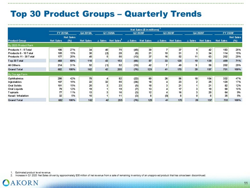 2020 Adjusted EBITDA to Unlevered Free Cash Flow 1. Reconciliation of Net (Loss) Income to Adjusted EBITDA appears on page 20 of the Appendix. 2. Forecast excludes income tax payments and refunds. 3. Reconciliations of Net Cash (Used In) Operating Activities to Unlevered Free Cash Flow from Operations and Unlevered Free Cas h F low appear on page 21 of the Appendix. 4. Forecast does not include any net proceeds related to the sale of India facility. 10 • Akorn continues to generate positive unlevered free cash flow from operations in spite of COVID - 19 impact. • Use of cash primarily driven by non - recurring / restructuring costs as well as interest on prepetition debt. ACTUAL FORECAST FY ($ in millions) Q1 2020 Q2 2020 Q3 2020 Q4 2020 2020 Net (Loss) Income ($257) ($75) ($72) $11 ($392) Net Cash (Used In) Operating Activities ($61) ($19) ($93) $27 ($147) Adjusted EBITDA 1 $59 ($0) $26 $49 $133 Less: Capital Expenditures (12) (10) (11) (11) (44) Less: Cash Income Taxes 2 0 0 0 0 0 Less: Change in Working Capital / Other (59) 38 (30) (1) (52) Unlevered Free Cash Flow From Operations 3 (11) 28 (15) 36 38 Less: Retention Payments (14) (10) (6) (6) (36) Less: Increased Insurance Premiums (6) 0 0 0 (6) Less: FDA Remediation (5) (3) (3) (3) (14) Less: Restructuring Professional Fees (11) (12) (7) 0 (30) Less: Cure Cost Payments 0 0 (10) 0 (10) Less: Winddown Funding 0 0 (35) 0 (35) Less: India Costs 4 (1) (1) (0) 0 (2) Unlevered Free Cash Flow 3 (48) 3 (76) 27 (95)