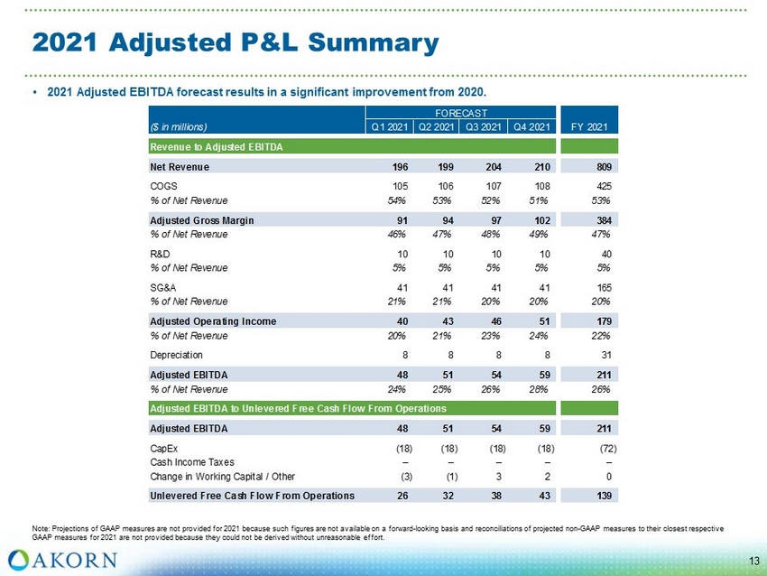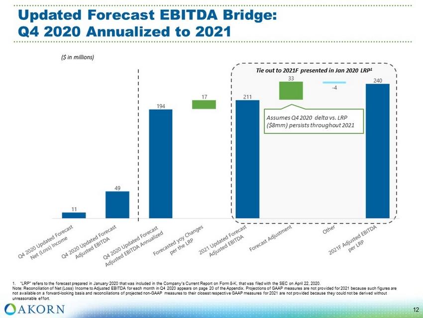 Tie out to 2021F presented in Jan 2020 LRP 1 Updated Forecast EBITDA Bridge: Q4 2020 Annualized to 2021 12 ($ in millions) 1. “LRP” refers to the forecast prepared in January 2020 that was included in the Company’s Current Report on Form 8 - K, that was fi led with the SEC on April 22, 2020. Note: Reconciliation of Net (Loss) Income to Adjusted EBITDA for each month in Q4 2020 appears on page 20 of the Appendix. Projections of GAAP measures are not provided for 2021 because such figures are not available on a forward - looking basis and reconciliations of projected non - GAAP measures to their closest respective GAAP mea sures for 2021 are not provided because they could not be derived without unreasonable effort. Assumes Q4 2020 delta vs. LRP ($8mm) persists throughout 2021