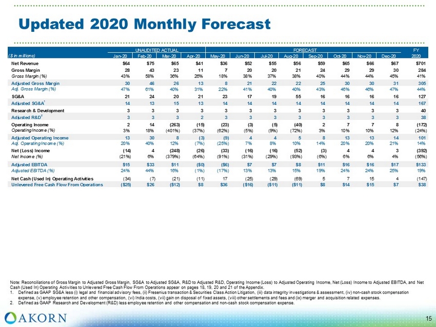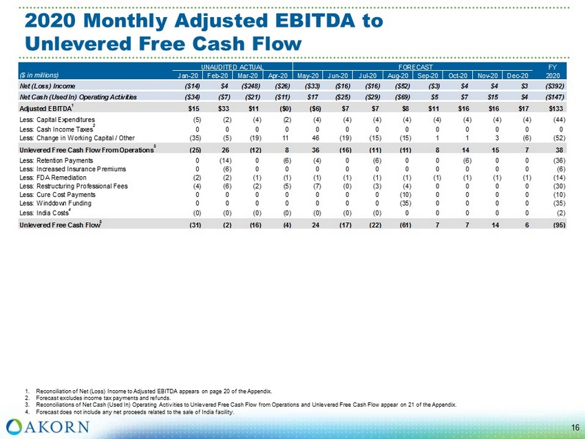 Updated 2020 Monthly Forecast 15 Note: Reconciliations of Gross Margin to Adjusted Gross Margin, SG&A to Adjusted SG&A, R&D to Adjusted R&D, Operating Income (Lo ss) to Adjusted Operating Income, Net (Loss) Income to Adjusted EBITDA, and Net Cash (Used In) Operating Activities to Unlevered Free Cash Flow From Operations appear on pages 18, 19, 20 and 21 of the Appendix. 1. Defined as GAAP SG&A less (i) legal and financial advisory fees, (ii) Fresenius transaction & Securities Class Action Litigat ion , (iii) data integrity investigations & assessment, (iv) non - cash stock compensation expense, (v) employee retention and other compensation, (vi) India costs, (vii) gain on disposal of fixed assets, (viii) othe r s ettlements and fees and (ix) merger and acquisition related expenses. 2. Defined as GAAP Research and Development (R&D) less employee retention and other compensation and non - cash stock compensation ex pense. UNAUDITED ACTUAL FORECAST FY ($ in millions) Jan-20 Feb-20 Mar-20 Apr-20 May-20 Jun-20 Jul-20 Aug-20 Sep-20 Oct-20 Nov-20 Dec-20 2020 Net Revenue $64 $75 $65 $41 $36 $52 $55 $56 $59 $65 $66 $67 $701 Gross Margin 28 43 23 11 7 20 20 21 24 29 29 30 284 Gross Margin (%) 43% 58% 36% 26% 18% 38% 37% 38% 40% 44% 44% 45% 41% Adjusted Gross Margin 30 46 26 13 8 21 22 22 25 30 30 31 305 Adj. Gross Margin (%) 47% 61% 40% 31% 22% 41% 40% 40% 43% 46% 46% 47% 44% SG&A 21 24 20 21 23 17 19 55 16 16 16 16 127 Adjusted SG&A 1 14 13 15 13 14 14 14 14 14 14 14 14 167 Research & Development 3 3 3 3 3 3 3 3 3 3 3 3 40 Adjusted R&D 2 3 3 3 2 3 3 3 3 3 3 3 3 38 Operating Income 2 14 (263) (15) (23) (3) (5) (40) 2 7 7 8 (172) Operating Income (%) 3% 18% (401%) (37%) (62%) (5%) (9%) (72%) 3% 10% 10% 12% (24%) Adjusted Operating Income 13 30 8 (3) (9) 4 4 5 8 13 13 14 101 Adj. Operating Income (%) 20% 40% 12% (7%) (25%) 7% 8% 10% 14% 20% 20% 21% 14% Net (Loss) Income (14) 4 (248) (26) (33) (16) (16) (52) (3) 4 4 3 (392) Net Income (%) (21%) 6% (379%) (64%) (91%) (31%) (29%) (93%) (6%) 6% 6% 4% (56%) Adjusted EBITDA $15 $33 $11 ($0) ($6) $7 $7 $8 $11 $16 $16 $17 $133 Adjusted EBITDA (%) 24% 44% 16% (1%) (17%) 13% 13% 15% 19% 24% 24% 25% 19% Net Cash (Used In) Operating Activities (34) (7) (21) (11) 17 (25) (29) (69) 5 7 15 4 (147) Unlevered Free Cash Flow From Operations ($25) $26 ($12) $8 $36 ($16) ($11) ($11) $8 $14 $15 $7 $38