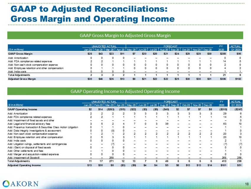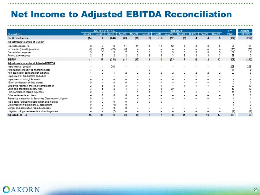 GAAP to Adjusted Reconciliations: SG&A and R&D 19 GAAP SG&A to Adjusted SG&A GAAP R&D to Adjusted R&D UNAUDITED ACTUAL FORECAST FY ACTUAL ($ in millions) Jan-20 Feb-20 Mar-20 Apr-20 May-20 Jun-20 Jul-20 Aug-20 Sep-20 Oct-20 Nov-20 Dec-20 2020 Q1 2020 GAAP SG&A $21 $24 $20 $21 $23 $17 $19 $55 $16 $16 $16 $16 $265 $65 Less: Legal and financial advisory fees 3 5 2 4 7 0 3 39 – – – – 63 10 Less: Fresenius transaction & Securities Class Action Litigation 0 1 1 0 – – – – – – – – 1 1 Less: Data integrity investigations & assessment 0 0 (0) 0 – – – – – – – – 1 0 Less: Non-cash stock compensation expense 1 1 1 1 2 2 2 2 2 2 2 2 17 3 Less: Employee retention and other compensation 1 3 2 2 1 1 1 1 1 1 1 1 14 7 Less: India costs 0 (0) 0 0 – – – – – – – – 1 0 Less: (Gain) on disposal of fixed assets 0 – 0 0 – – – – – – – – 0 0 Less: Other settlements and fees – 1 0 0 – – – – – – – – 1 1 Less: Merger and acquisition-related expenses 0 0 0 0 – – – – – – – – 0 0 Total Adjustments 6 11 5 8 9 2 5 42 2 2 2 2 98 23 Adjusted SG&A $14 $13 $15 $13 $14 $14 $14 $14 $14 $14 $14 $14 $167 $42 UNAUDITED ACTUAL FORECAST FY ACTUAL ($ in millions) Jan-20 Feb-20 Mar-20 Apr-20 May-20 Jun-20 Jul-20 Aug-20 Sep-20 Oct-20 Nov-20 Dec-20 2020 Q1 2020 GAAP R&D $3 $3 $3 $3 $3 $3 $3 $3 $3 $3 $3 $3 $40 $10 Less: Employee retention and other compensation 0 0 0 0 – – – – – – – – 1 1 Less: Non-cash stock compensation expense (0) 0 0 0 0 0 0 0 0 0 0 0 1 0 Total Adjustments 0 1 0 0 0 0 0 0 0 0 0 0 2 1 Adjusted R&D $3 $3 $3 $2 $3 $3 $3 $3 $3 $3 $3 $3 $38 $9