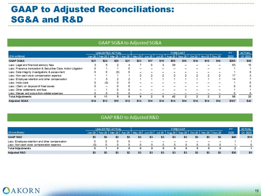 GAAP to Adjusted Reconciliations: Gross Margin and Operating Income 18 GAAP Gross Margin to Adjusted Gross Margin GAAP Operating Income to Adjusted Operating Income UNAUDITED ACTUAL FORECAST FY ACTUAL ($ in millions) Jan-20 Feb-20 Mar-20 Apr-20 May-20 Jun-20 Jul-20 Aug-20 Sep-20 Oct-20 Nov-20 Dec-20 2020 Q1 2020 GAAP Gross Margin $28 $43 $23 $11 $7 $20 $20 $21 $24 $29 $29 $30 $285 $95 Add: Amortization 0 0 0 0 – – – – – – – – 0 0 Add: FDA compliance related expenses 2 2 1 1 1 1 1 1 1 1 1 1 14 5 Add: Non-cash stock compensation expense 0 0 0 0 0 0 0 0 0 0 0 0 2 0 Add: Employee retention and other compensation 0 1 1 1 0 0 0 0 0 0 0 0 4 2 Add: India costs 0 0 0 0 – – – – – – – – 1 1 Total Adjustments 2 3 3 2 1 1 1 1 1 1 1 1 21 8 Adjusted Gross Margin $30 $46 $26 $13 $8 $21 $22 $22 $25 $30 $30 $31 $306 $102 UNAUDITED ACTUAL FORECAST FY ACTUAL ($ in millions) Jan-20 Feb-20 Mar-20 Apr-20 May-20 Jun-20 Jul-20 Aug-20 Sep-20 Oct-20 Nov-20 Dec-20 2020 Q1 2020 GAAP Operating Income $2 $14 ($263) ($15) ($22) ($3) ($5) ($40) $2 $7 $7 $8 ($310) ($247) Add: Amortization 2 2 2 2 3 3 3 3 3 3 3 3 29 6 Add: FDA compliance related expenses 2 2 1 1 1 1 1 1 1 1 1 1 14 5 Add: Impairment of fixed assets and other – – – – – – – – – – – – – 0 Add: Legal and financial advisory fees 3 5 2 4 7 0 3 39 – – – – 63 10 Add: Fresenius transaction & Securities Class Action Litigation 0 1 1 0 – – – – – – – – 1 1 Add: Data integrity investigations & assessment 0 0 (0) 0 – – – – – – – – 1 0 Add: Non-cash stock compensation expense 1 2 1 2 2 2 2 2 2 2 2 2 20 3 Add: Employee retention and other compensation 2 5 3 3 1 1 1 1 1 1 1 1 20 10 Add: India costs 0 0 0 0 – – – – – – – – 2 1 Add: Litigation rulings, settlements and contingencies – – (7) – – – – – – – – – (7) (7) Add: (Gain) on disposal of fixed assets 0 – 0 0 – – – – – – – – 0 0 Add: Other settlements and fees – 1 0 0 – – – – – – – – 1 1 Add: Merger and acquisition-related expenses 0 0 0 0 – – – – – – – – 0 0 Add: Impairment of Goodwill – – 268 – – – – – – – – – 268 268 Total Adjustments 11 17 271 12 13 7 9 46 6 6 6 6 410 298 Adjusted Operating Income $13 $30 $8 ($3) ($9) $4 $4 $5 $8 $13 $13 $14 $101 $51