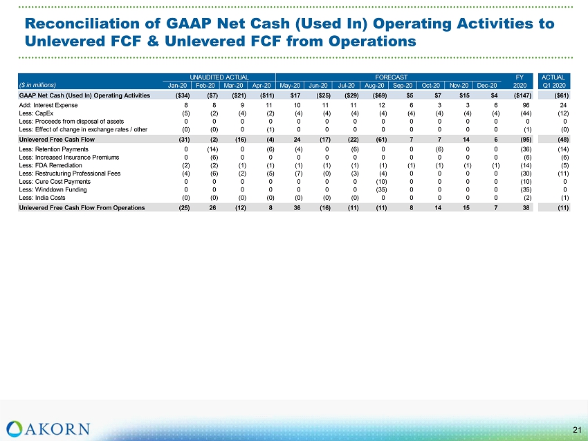 Net Income to Adjusted EBITDA Reconciliation 20 UNAUDITED ACTUAL FORECAST FY ACTUAL ($ in millions) Jan-20 Feb-20 Mar-20 Apr-20 May-20 Jun-20 Jul-20 Aug-20 Sep-20 Oct-20 Nov-20 Dec-20 2020 Q1 2020 Net (Loss) Income (14) 4 (248) (26) (33) (16) (16) (52) (3) 4 4 3 (392) (257) Adjustments to arrive at EBITDA: Interest Expense, Net 8 8 9 11 11 11 11 12 5 3 3 5 95 24 Income tax (benefit)/provision (0) (0) (23) (0) – – – – – – – – (23) (23) Depreciation expense 3 3 3 2 3 3 3 3 3 3 3 3 32 8 Amortization expense 2 2 2 2 3 3 3 3 3 3 3 3 29 6 EBITDA (1) 17 (258) (11) (17) 1 0 (35) 7 12 12 13 (259) (242) Adjustments to arrive at Adjusted EBITDA Impairment of goodwill – – 268 – – – – – – – – – 268 268 Amortization of deferred financing costs 7 2 – – – 2 – – – – – – 11 9 Non-cash stock compensation expense 1 2 1 2 2 2 2 2 2 2 2 2 20 3 Impairment of fixed assets and other – – – – – – – – – – – – – – Impairment of intangible assets – – – – – – – – – – – – – – (Gain) on disposal of fixed assets 0 – 0 0 – – – – – – – – 0 0 Employee retention and other compensation 2 5 3 3 1 1 1 1 1 1 1 1 20 10 Legal and financial advisory fees 3 5 2 4 7 0 3 39 – – – – 63 10 FDA compliance related expenses 2 2 1 1 1 1 1 1 1 1 1 1 14 5 Other settlements and fees – 1 0 0 – – – – – – – – 1 1 Fresenius transaction & Securities Class Action Litigation 0 1 1 0 – – – – – – – – 1 1 India costs (excluding depreciation and interest) 0 0 0 0 0 0 0 – – – – – 2 1 Data integrity investigations & assessment 0 0 (0) 0 – – – – – – – – 1 0 Merger and acquisition-related expenses 0 0 0 0 – – – – – – – – 0 0 Litigation rulings, settlements and contingencies – – (7) – – – – – – – – – (7) (7) Adjusted EBITDA 15 33 11 (0) (6) 7 7 8 11 16 16 17 133 59