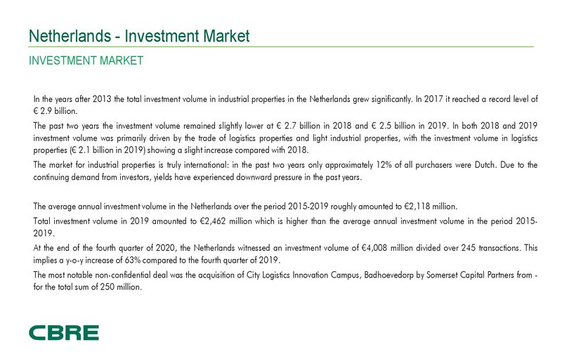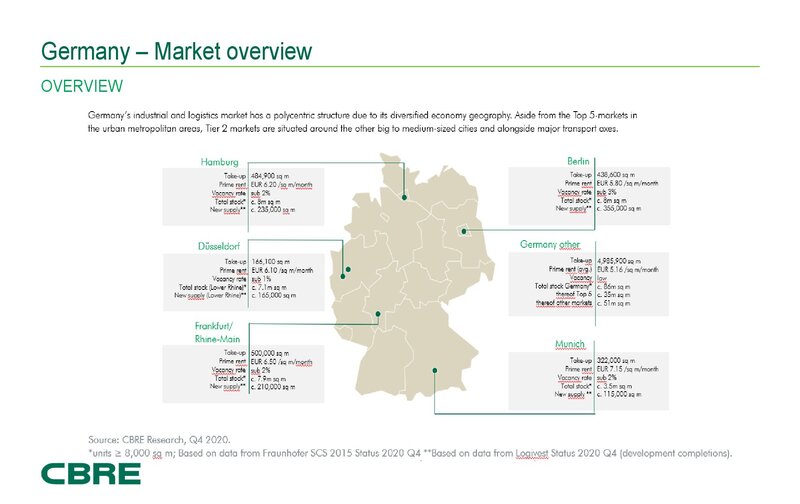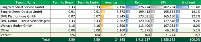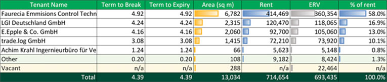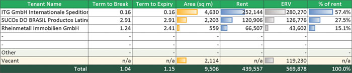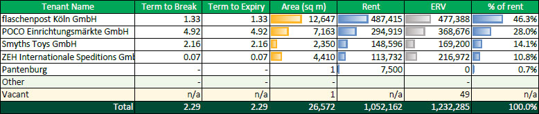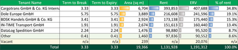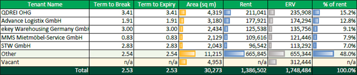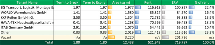 | Property Description | 49 assets located across Germany and The Netherlands, as summarised in the schedule of capital values. The portfolio predominantly includes logistics, warehouse, industrial or light industrial assets either used in part or featuring ancillary office, commercial (including showroom / trade counter), storage or space designated as other. One asset in the portfolio would be considered an office asset (Nieuwegen). | |