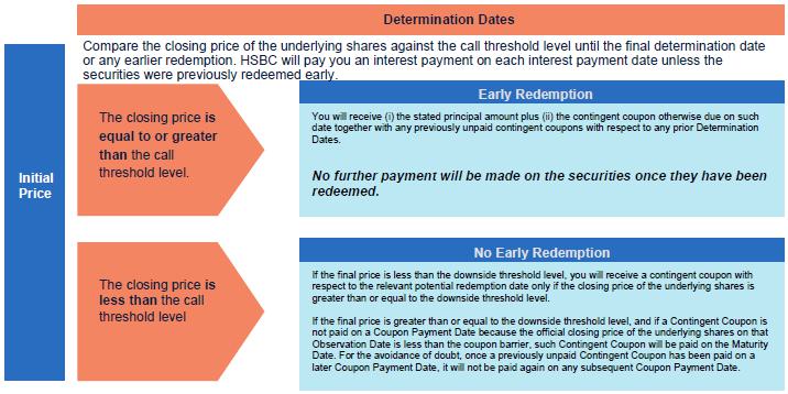 | Contingent Coupon: | If the official closing price of the Underlying Shares on any Determination Date or the final price is equal to or greater than the Coupon Barrier, HSBC will pay you the Contingent Coupon on the corresponding Coupon Payment Date as well as any previously unpaid Contingent Coupon with respect to a prior Determination Date. If the official closing price of the Underlying Shares on any Determination Date or the final price is less than the Coupon Barrier, the Contingent Coupon applicable to such date will not be payable and HSBC will not make any payment to you on the relevant Coupon Payment Date. If a Contingent Coupon is not paid on a Coupon Payment Date because the official closing price of the underlying shares on that Observation Date is less than the coupon barrier, such Contingent Coupon will be paid on a later Coupon Payment Date if the official closing price or the final price, as applicable, is equal to or greater than the coupon barrier on such later Observation Date. For the avoidance of doubt, once a previously unpaid Contingent Coupon has been paid on a later Coupon Payment Date, it will not be paid again on any subsequent Coupon Payment Date. The Contingent Coupon is $26.00 per Note per each Coupon Payment Date. The table below sets forth the expected Observation Dates, Coupon Payment Dates and the potential Contingent Coupons. Contingent Coupon |