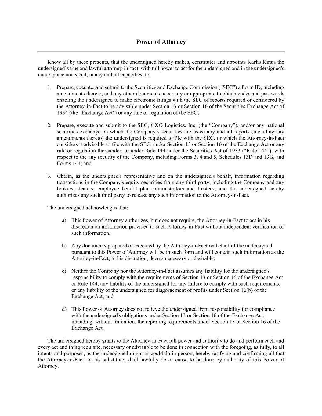 Power of Attorney Know all by these presents, that the undersigned hereby makes, constitutes and appoints Karlis Kirsis the undersigned’s true and lawful attorney-in-fact, with full power to act for the undersigned and in the undersigned's name, place and stead, in any and all capacities, to: 1. Prepare, execute, and submit to the Securities and Exchange Commission ("SEC") a Form ID, including amendments thereto, and any other documents necessary or appropriate to obtain codes and passwords enabling the undersigned to make electronic filings with the SEC of reports required or considered by the Attorney-in-Fact to be advisable under Section 13 or Section 16 of the Securities Exchange Act of 1934 (the "Exchange Act") or any rule or regulation of the SEC; 2. Prepare, execute and submit to the SEC, GXO Logistics, Inc. (the “Company”), and/or any national securities exchange on which the Company’s securities are listed any and all reports (including any amendments thereto) the undersigned is required to file with the SEC, or which the Attorney-in-Fact considers it advisable to file with the SEC, under Section 13 or Section 16 of the Exchange Act or any rule or regulation thereunder, or under Rule 144 under the Securities Act of 1933 (“Rule 144”), with respect to the any security of the Company, including Forms 3, 4 and 5, Schedules 13D and 13G, and Forms 144; and 3. Obtain, as the undersigned's representative and on the undersigned's behalf, information regarding transactions in the Company's equity securities from any third party, including the Company and any brokers, dealers, employee benefit plan administrators and trustees, and the undersigned hereby authorizes any such third party to release any such information to the Attorney-in-Fact. The undersigned acknowledges that: a) This Power of Attorney authorizes, but does not require, the Attorney-in-Fact to act in his discretion on information provided to such Attorney-in-Fact without independent verification of such information; b) Any documents prepared or executed by the Attorney-in-Fact on behalf of the undersigned pursuant to this Power of Attorney will be in such form and will contain such information as the Attorney-in-Fact, in his discretion, deems necessary or desirable; c) Neither the Company nor the Attorney-in-Fact assumes any liability for the undersigned's responsibility to comply with the requirements of Section 13 or Section 16 of the Exchange Act or Rule 144, any liability of the undersigned for any failure to comply with such requirements, or any liability of the undersigned for disgorgement of profits under Section 16(b) of the Exchange Act; and d) This Power of Attorney does not relieve the undersigned from responsibility for compliance with the undersigned's obligations under Section 13 or Section 16 of the Exchange Act, including, without limitation, the reporting requirements under Section 13 or Section 16 of the Exchange Act. The undersigned hereby grants to the Attorney-in-Fact full power and authority to do and perform each and every act and thing requisite, necessary or advisable to be done in connection with the foregoing, as fully, to all intents and purposes, as the undersigned might or could do in person, hereby ratifying and confirming all that the Attorney-in-Fact, or his substitute, shall lawfully do or cause to be done by authority of this Power of Attorney.