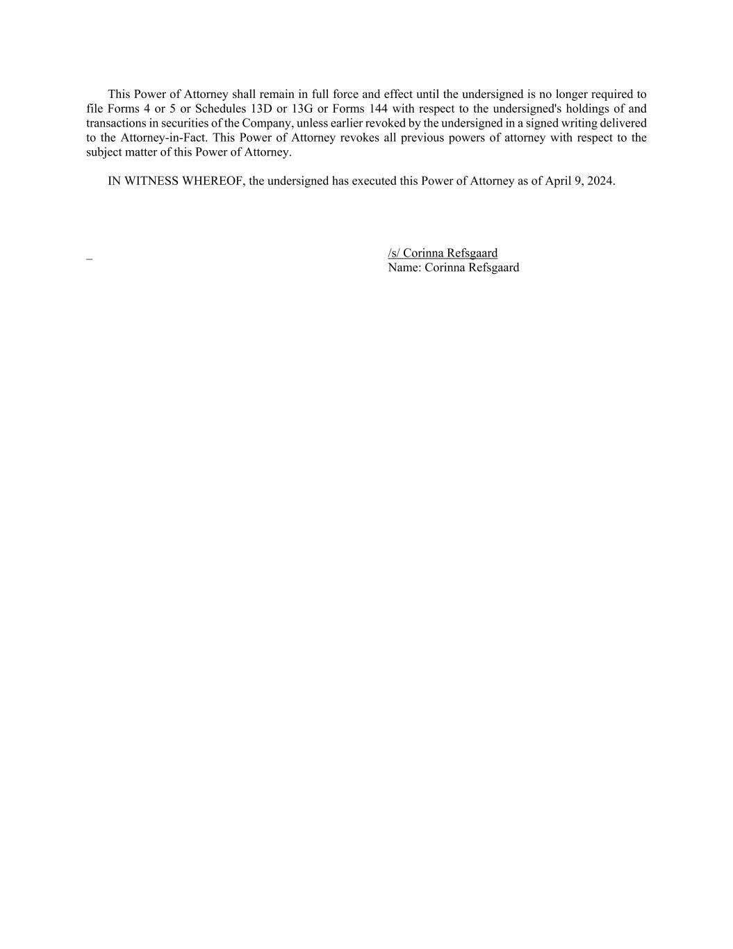 This Power of Attorney shall remain in full force and effect until the undersigned is no longer required to file Forms 4 or 5 or Schedules 13D or 13G or Forms 144 with respect to the undersigned's holdings of and transactions in securities of the Company, unless earlier revoked by the undersigned in a signed writing delivered to the Attorney-in-Fact. This Power of Attorney revokes all previous powers of attorney with respect to the subject matter of this Power of Attorney. IN WITNESS WHEREOF, the undersigned has executed this Power of Attorney as of April 9, 2024. _ /s/ Corinna Refsgaard Name: Corinna Refsgaard
