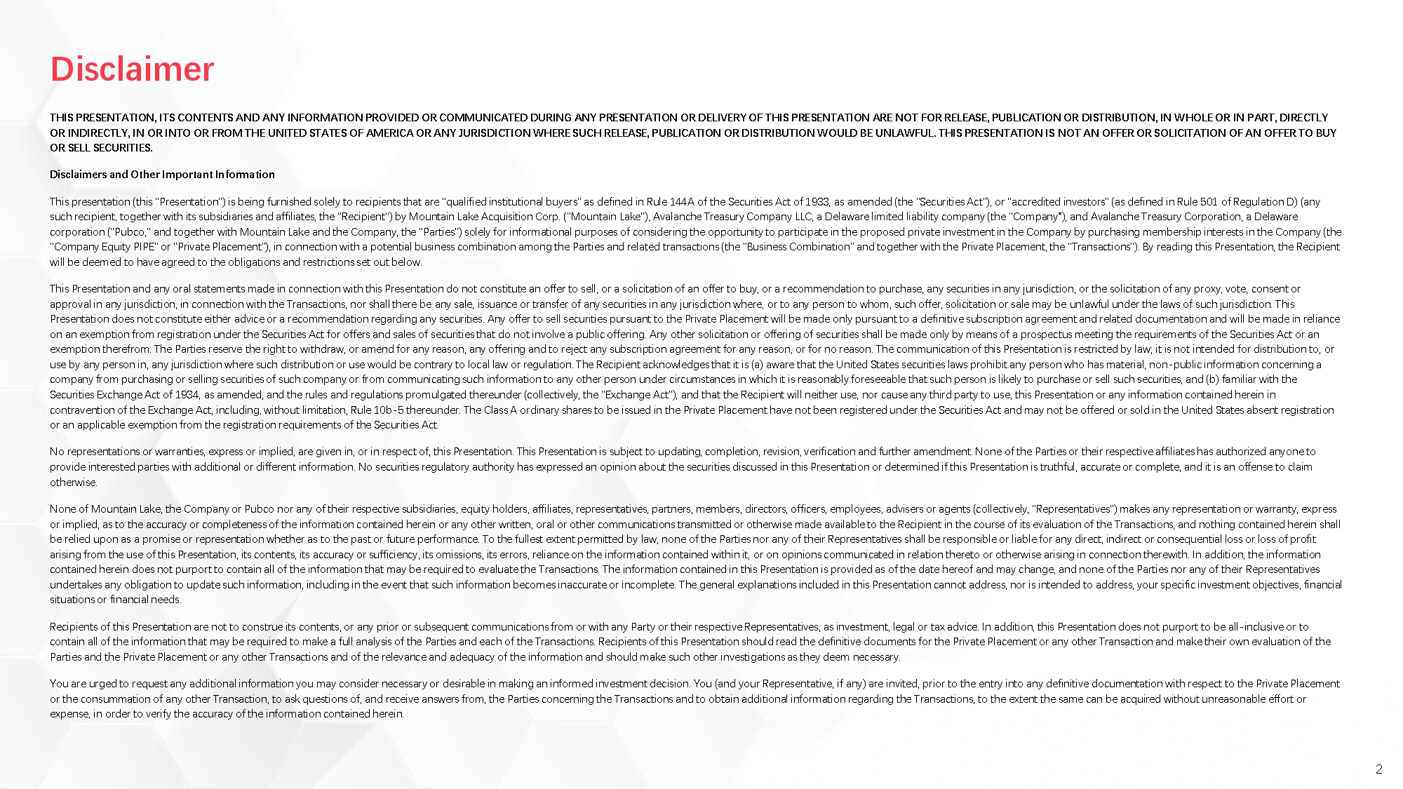 Pubco and Newco intend to file with the Securities and Exchange Commission (the “SEC”) a Registration Statement on Form S-4 (as may be amended, the “Registration Statement”), which will include a preliminary proxy statement of Mountain Lake and a prospectus (the “Proxy Statement/Prospectus”) in connection with the Proposed Transactions. The definitive proxy statement and other relevant documents will be mailed to shareholders of Mountain Lake as of a record date to be established for voting on the Business Combination and other matters as described in the Proxy Statement/Prospectus. Mountain Lake and/or Pubco will also file other documents regarding the Proposed Transactions with the SEC. This Current Report on Form 8-K (this “Report”) does not contain all of the information that should be considered concerning the Proposed Transactions and is not intended to form the basis of any investment decision or any other decision in respect of the Proposed Transactions. BEFORE MAKING ANY VOTING OR INVESTMENT DECISION, SHAREHOLDERS OF MOUNTAIN LAKE AND OTHER INTERESTED PARTIES ARE URGED TO READ, WHEN AVAILABLE, THE PRELIMINARY PROXY STATEMENT/PROSPECTUS, AND AMENDMENTS THERETO, AND THE DEFINITIVE PROXY STATEMENT/PROSPECTUS AND ALL OTHER RELEVANT DOCUMENTS FILED OR THAT WILL BE FILED WITH THE SEC IN CONNECTION WITH MOUNTAIN LAKE’S SOLICITATION OF PROXIES FOR THE EXTRAORDINARY GENERAL MEETING OF ITS SHAREHOLDERS TO BE HELD TO APPROVE THE PROPOSED TRANSACTIONS AND OTHER MATTERS AS DESCRIBED IN THE PROXY STATEMENT/PROSPECTUS BECAUSE THESE DOCUMENTS WILL CONTAIN IMPORTANT INFORMATION ABOUT MOUNTAIN LAKE, NEWCO, PUBCO AND THE PROPOSED TRANSACTIONS. Investors and security holders will also be able to obtain copies of the Registration Statement and the Proxy Statement/Prospectus and all other documents filed or that will be filed with the SEC by Mountain Lake and Pubco, without charge, once available, on the SEC’s website at www.sec.gov or by directing a request to: Mountain Lake Acquisition Corp., 930 Tahoe Blvd STE 802 PMB 45, Incline Village, NV 89451; phone number: (775) 204-1489.