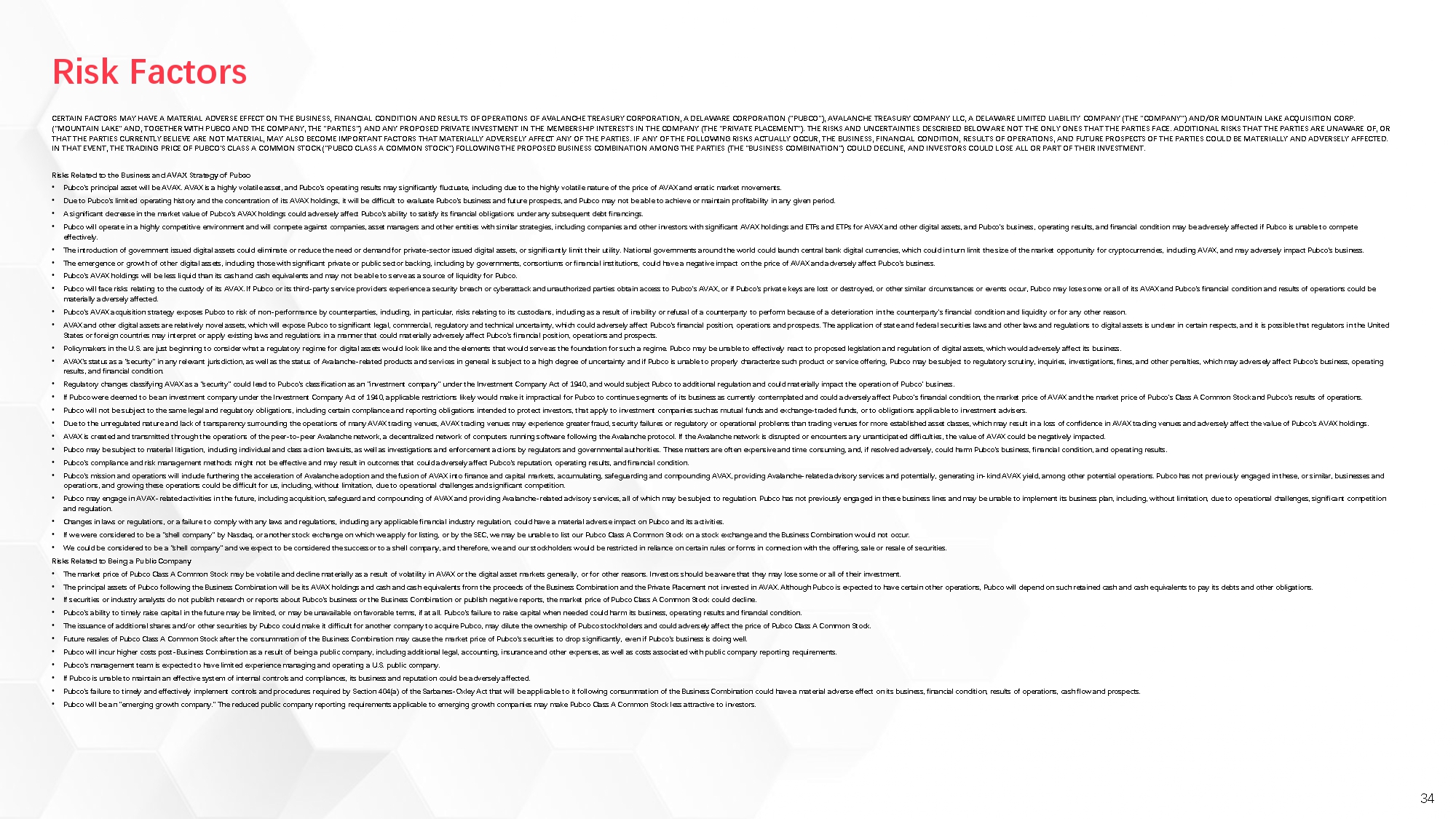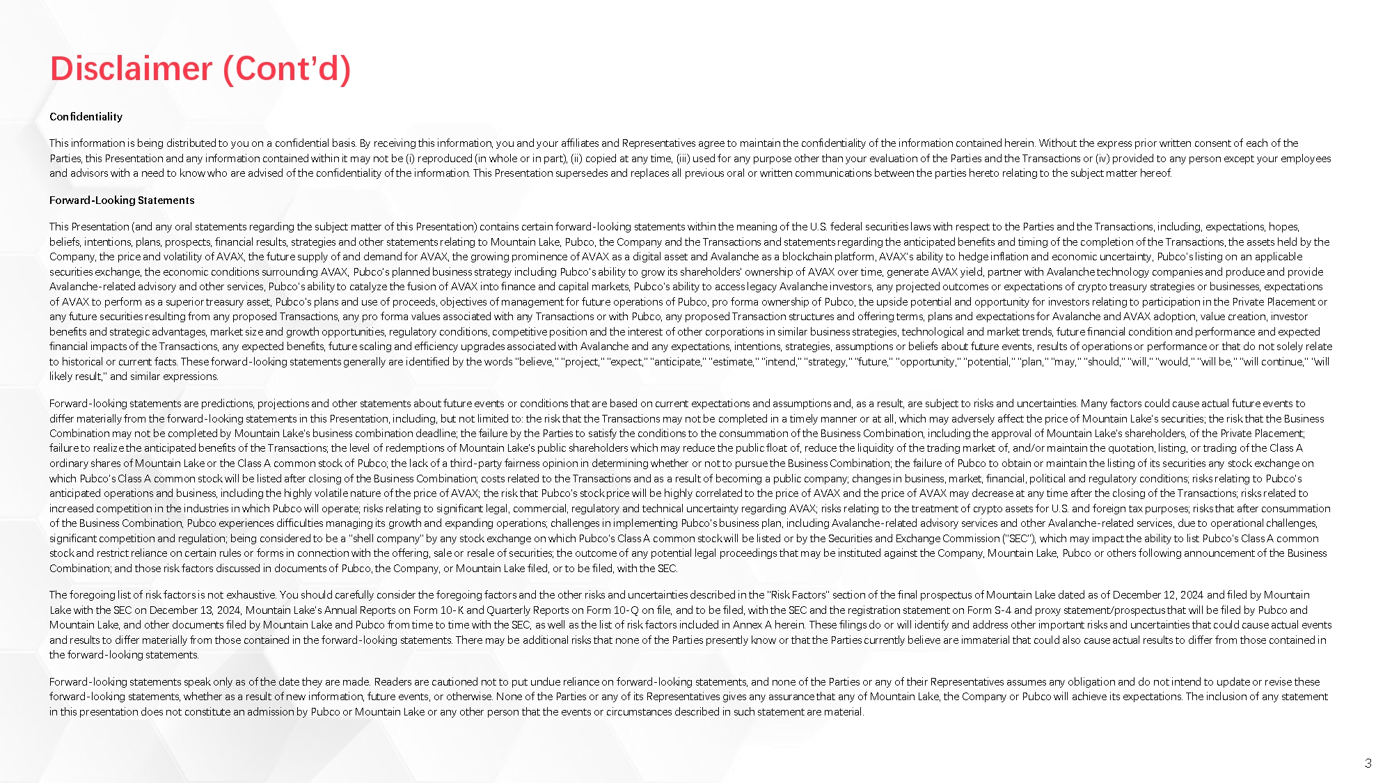 Forward-looking statements are predictions, projections and other statements about future events or conditions that are based on current expectations and assumptions and, as a result, are subject to risks and uncertainties. Many factors could cause actual future events to differ materially from the forward-looking statements in this Report, including, but not limited to: the risk that the Proposed Transactions may not be completed in a timely manner or at all, which may adversely affect the price of Mountain Lake’s securities; the risk that the Business Combination may not be completed by Mountain Lake’s business combination deadline; the failure by the parties to the Business Combination Agreement to satisfy the conditions to the consummation of the Business Combination, including the approval of Mountain Lake’s shareholders, or any of the Private Placement; failure to realize the anticipated benefits of the Proposed Transactions; the level of redemptions of Mountain Lake’s public shareholders which may reduce the public float of, reduce the liquidity of the trading market of, and/or maintain the quotation, listing, or trading of the Pubco Class A stock; the lack of a third-party fairness opinion in determining whether or not to pursue the Business Combination; the failure of Pubco to obtain or maintain the listing of its securities any stock exchange on which Pubco Class A Stock will be listed after closing of the Business Combination; costs related to the Proposed Transactions and as a result of becoming a public company; changes in business, market, financial, political and regulatory conditions; risks relating to Pubco’s anticipated operations and business, including the highly volatile nature of the price of AVAX; the risk that Pubco’s stock price will be highly correlated to the price of AVAX and the price of AVAX may decrease at any time after the closing of the Proposed Transactions; risks related to increased competition in the industries in which Pubco will operate; risks relating to significant legal, commercial, regulatory and technical uncertainty regarding AVAX; risks relating to the treatment of crypto assets for U.S. and foreign tax purposes; risks that after consummation of the Business Combination, Pubco experiences difficulties managing its growth and expanding operations; challenges in implementing Pubco’s business plan, including AVAX-related advisory services and other AVAX-related services, due to operational challenges, significant competition and regulation; being considered to be a “shell company” by any stock exchange on which Pubco Class A Stock will be listed or by the SEC, which may impact the ability to list Pubco Class A Stock and restrict reliance on certain rules or forms in connection with the offering, sale or resale of securities; the outcome of any potential legal proceedings that may be instituted against Newco, Mountain Lake, Pubco or others following announcement of the Business Combination; and those risk factors discussed in documents of Pubco, Newco, or Mountain Lake filed, or to be filed, with the SEC.