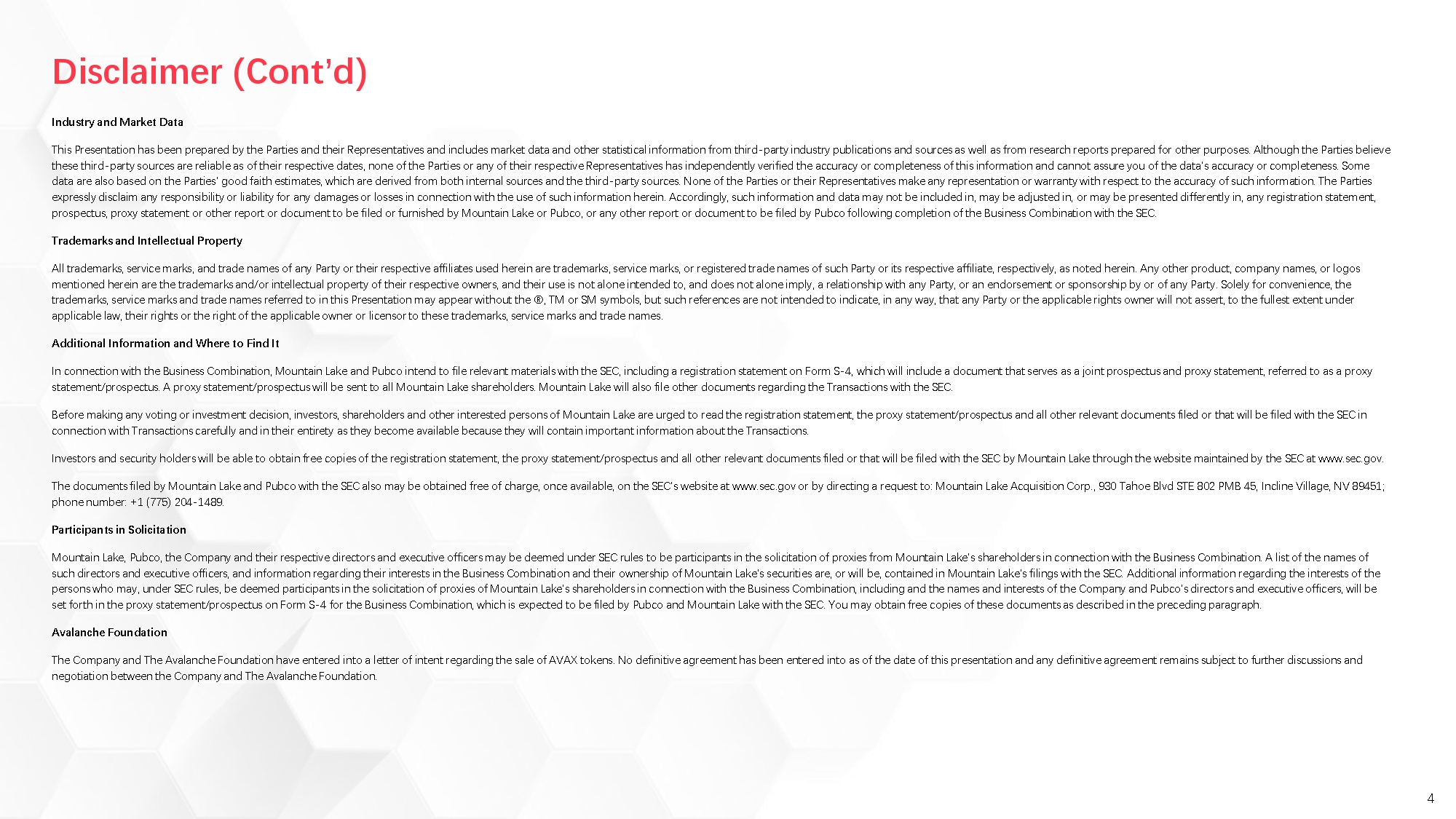 This Report contains certain forward-looking statements within the meaning of the U.S. federal securities laws with respect to the parties and the Proposed Transactions, including, expectations, hopes, beliefs, intentions, plans, prospects, financial results, strategies and other statements relating to Mountain Lake, Pubco, Newco and the Proposed Transactions and statements regarding the anticipated benefits and timing of the completion of the Proposed Transactions, the assets held by Newco, the price and volatility of AVAX, AVAX’s growing prominence as a digital asset and as the foundation of a new monetary system, AVAX’s ability to hedge inflation and economic uncertainty, Pubco’s listing on an applicable securities exchange, the economic conditions surrounding AVAX, Pubco’s planned business strategy including Pubco’s ability to grow its shareholders’ ownership of AVAX over time, generate AVAX yield, partner with AVAX technology companies and produce and provide AVAX-related advisory and other services, Pubco’s ability to catalyze the fusion of AVAX into finance and capital markets, Pubco’s ability to access legacy AVAX investors, any projected outcomes or expectations of crypto treasury strategies or businesses, expectations of AVAX to perform as a superior treasury asset, Pubco’s plans and use of proceeds, objectives of management for future operations of Pubco, pro forma ownership of Pubco, the upside potential and opportunity for investors relating to participation in the Private Placement or any future securities resulting from any Proposed Transactions, any pro forma values associated with any Proposed Transactions or with Pubco, any proposed transaction structures and offering terms, plans and expectations for AVAX adoption, value creation, investor benefits and strategic advantages, market size and growth opportunities, regulatory conditions, competitive position and the interest of other corporations in similar business strategies, technological and market trends, future financial condition and performance and expected financial impacts of the Proposed Transactions, any expected benefits, future scaling and efficiency upgrades associated with AVAX and any expectations, intentions, strategies, assumptions or beliefs about future events, results of operations or performance or that do not solely relate to historical or current facts. These forward-looking statements generally are identified by the words “believe,” “project,” “expect,” “anticipate,” “estimate,” “intend,” “strategy,” “future,” “opportunity,” “potential,” “plan,” “may,” “should,” “will,” “would,” “will be,” “will continue,” “will likely result,” and similar expressions.