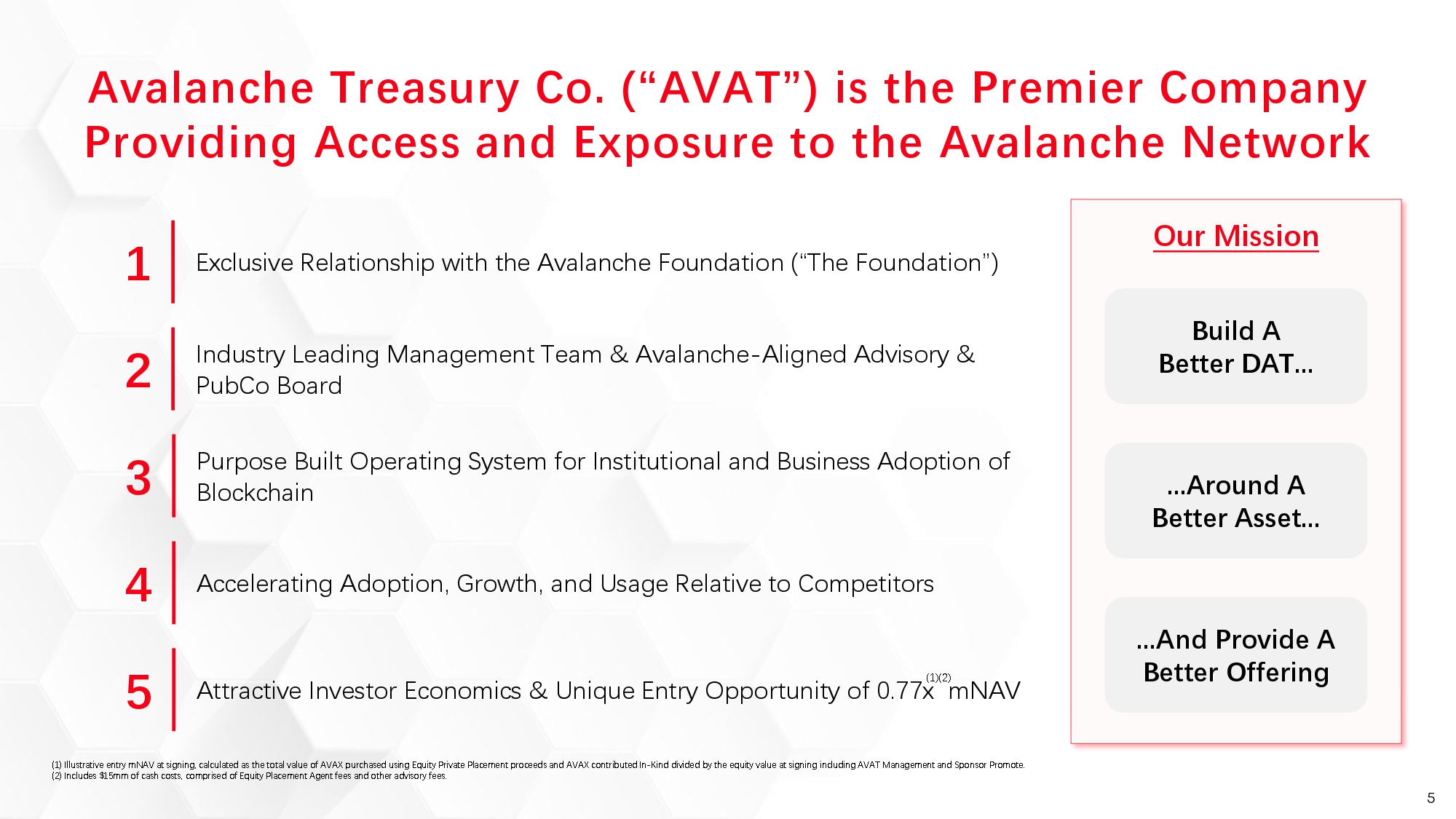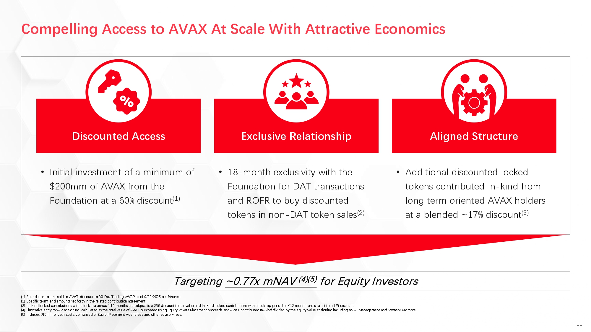 AVAT launches with an initial AVAX token purchase at a discount to market price and 18-month priority on Avalanche Foundation sales to U.S. digital asset treasury companies. AVAT delivers an entry point of 0.77x multiple of net asset value (“mNAV”) for investors, a 23% discount compared to buying AVAX directly or through passive ETF alternatives (in each case as of today).