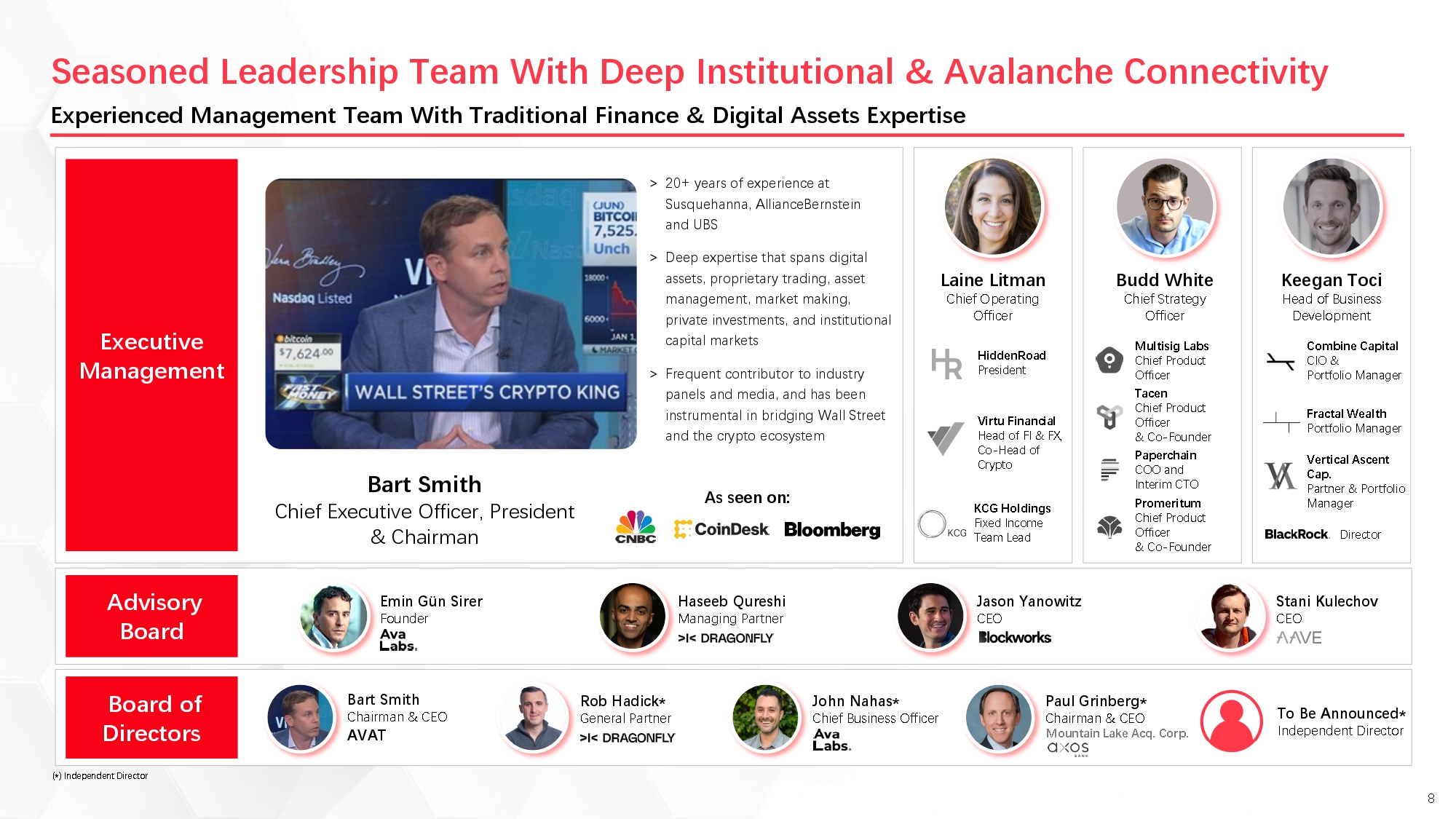 AVAT CEO Bart Smith brings over two decades of Wall Street experience from Susquehanna International Group and AllianceBernstein, where he was an early pioneer in bridging Wall Street and digital assets with one of the first dedicated desks of its time. The executive team includes COO Laine Litman (formerly President of HiddenRoad and Head of FI & FX, Co-Head of Crypto at Virtu Financial) and Chief Strategy Officer Budd White (former Chief Product Officer at Multisig Labs).
