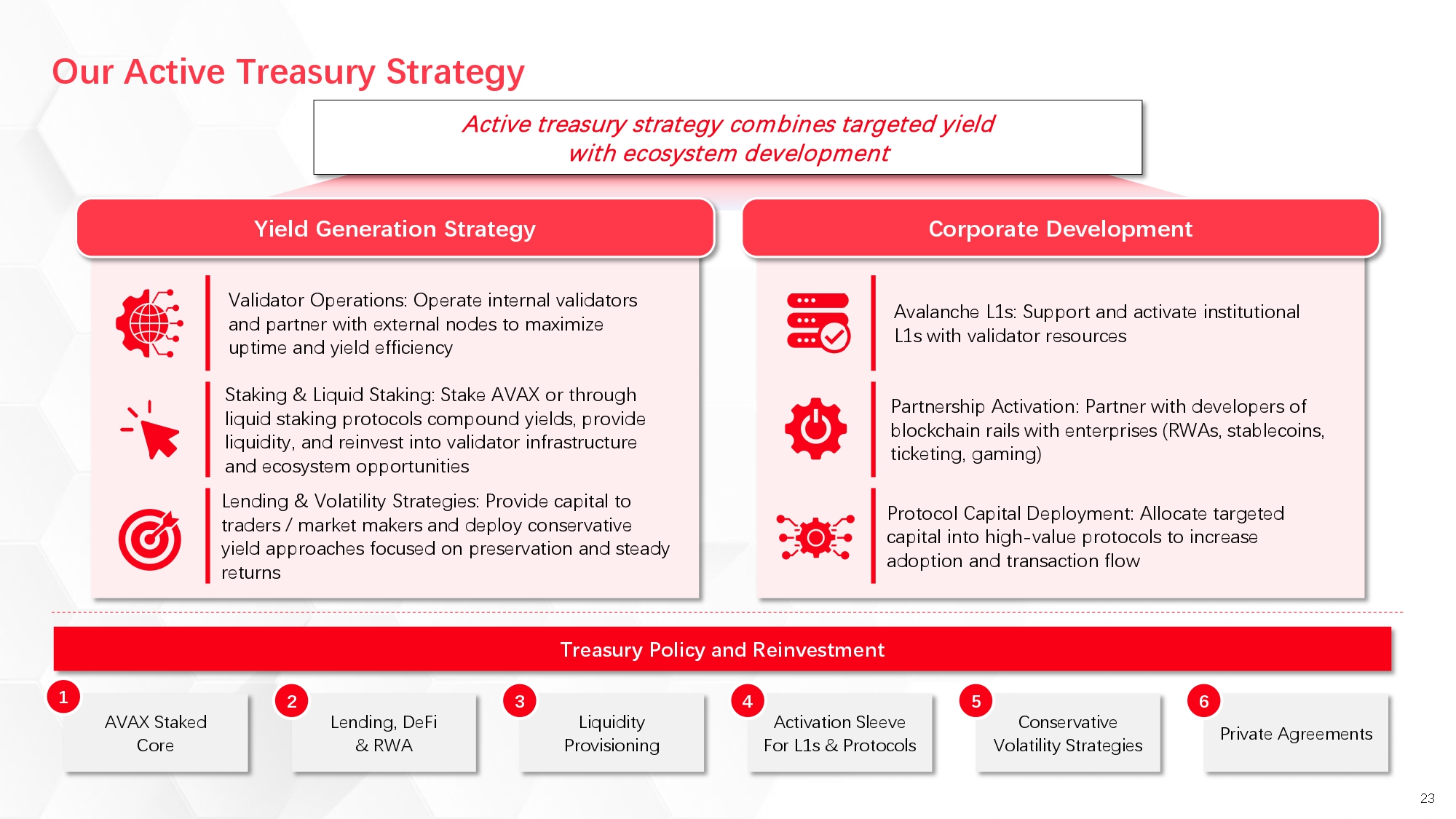 AVAT believes that it represents an evolution in digital asset treasuries, moving beyond passive accumulation models and simple ETF wrappers. AVAT intends to deploy capital directly into the Avalanche ecosystem through three strategic pillars: targeted protocol investments to drive adoption and transaction flow, partnership activation with enterprises building on-chain rails for RWAs, stablecoins, and payments, and direct support for institutional L1 launches with validator resources and liquidity.