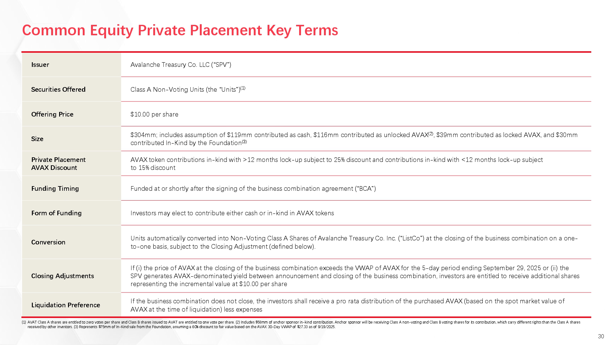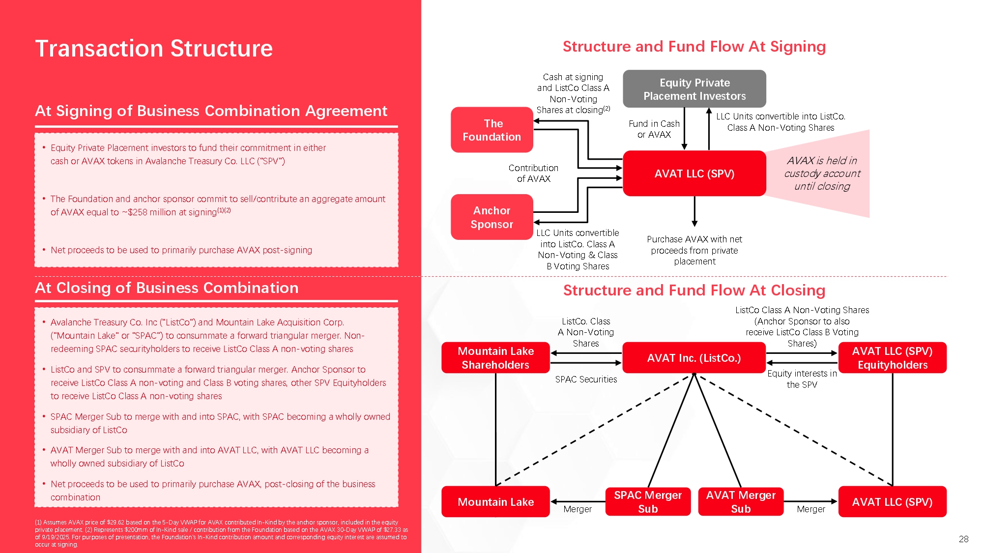 Contemporaneously with the execution of the Business Combination Agreement, certain investors (the “LLC Equity PIPE Investors”) have agreed to make a private investment in Newco by purchasing Newco Units (the “Newco Units”) payable in cash (in the aggregate of approximately $119 million), unlocked AVAX (in the aggerated of approximately $116 million) or locked AVAX (in the aggregate of approximately $69 million) (the “Private Placement”, and together with the Business Combination, the “Proposed Transactions”), pursuant to subscription agreements entered into with Mountain Lake, Pubco and Newco. The number of Newco Units to be issued in exchange for AVAX will equal the volume-weighted average price (calculated by dividing the sum of the products of each trade’s price and volume by the total volume of all trades during the specified period) of AVAX denominated in USD as calculated from all executed trades on Binance Holdings Ltd (or its successor primary spot exchange) over the five-day period ending at 8:00 p.m. New York City time on September 29, 2025 (the “Signing AVAX Price”), multiplied by the number of AVAX contributed by such investor, and then divided by $10.00.
