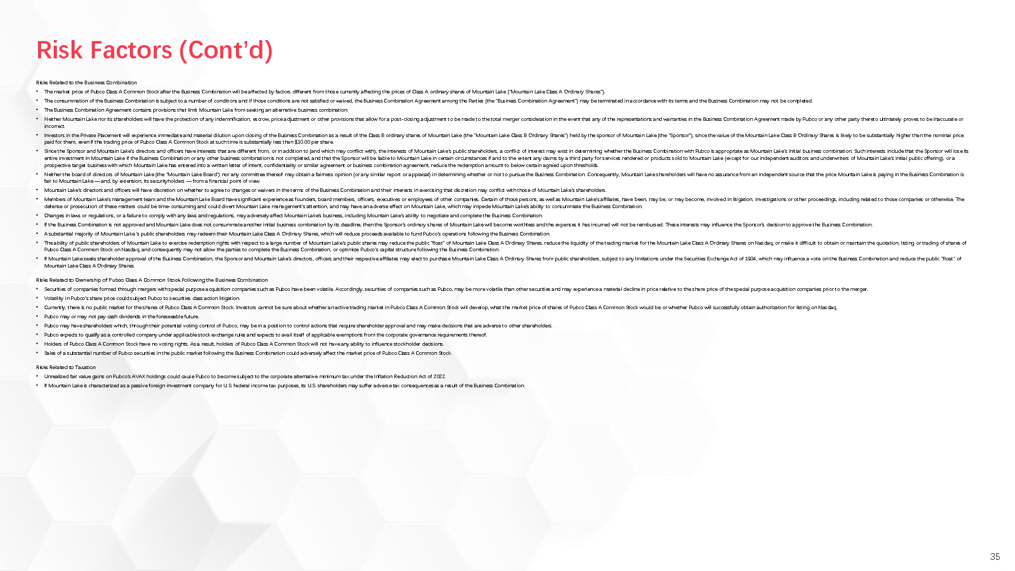 The foregoing list of risk factors is not exhaustive. You should carefully consider the foregoing factors and the other risks and uncertainties described in the “Risk Factors” section of the final prospectus of Mountain Lake dated as of December 12, 2024 and filed by Mountain Lake with the SEC on December 13, 2024, Mountain Lake’s Annual Reports on Form 10-K and Quarterly Reports on Form 10-Q on file, and to be filed, with the SEC and the Proxy Statement/Prospectus that will be filed by Pubco and Newco, and other documents filed by Mountain Lake and Pubco from time to time with the SEC. These filings do or will identify and address other important risks and uncertainties that could cause actual events and results to differ materially from those contained in the forward-looking statements. There may be additional risks that none of Mountain Lake, Pubco or Newco presently know or that none of Mountain Lake, Pubco or Newco currently believe are immaterial that could also cause actual results to differ from those contained in the forward-looking statements.