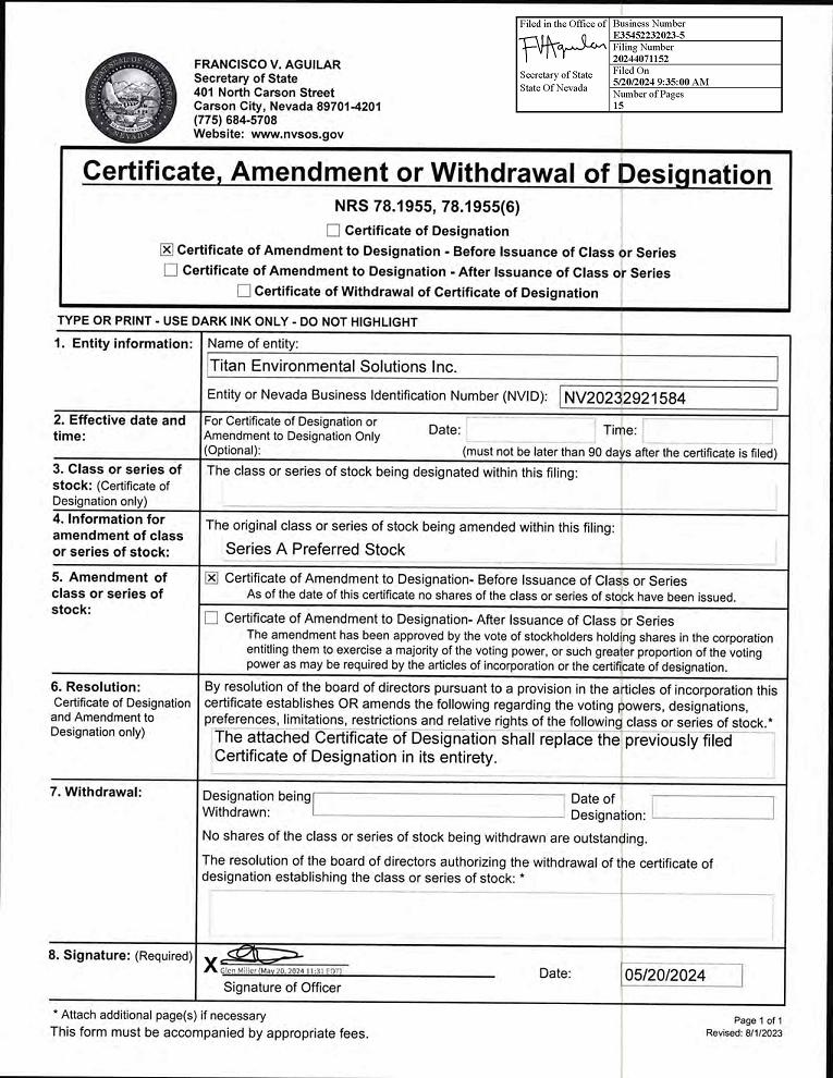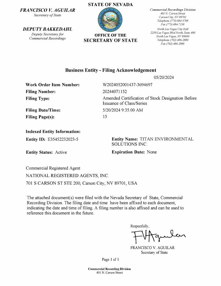 | Date: June 4, 2024 | TITAN ENVIRONMENTAL SOLUTIONS INC. | |