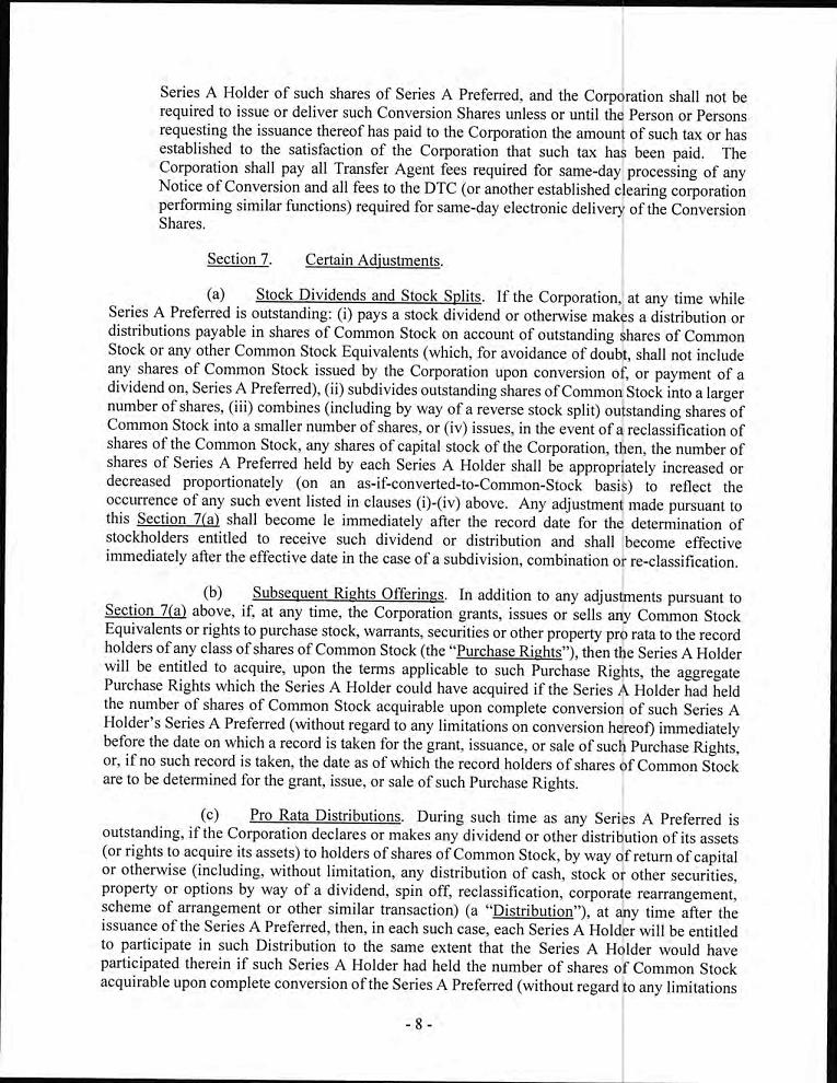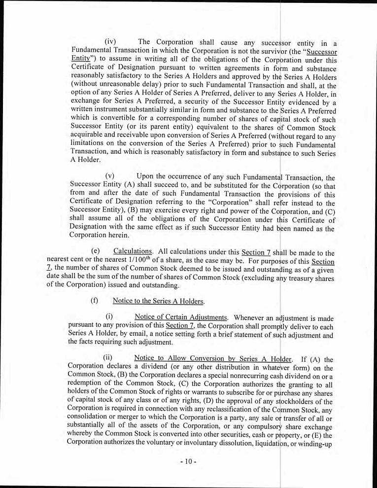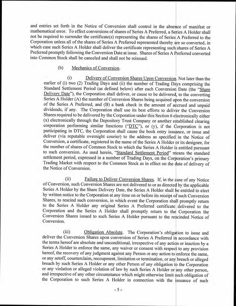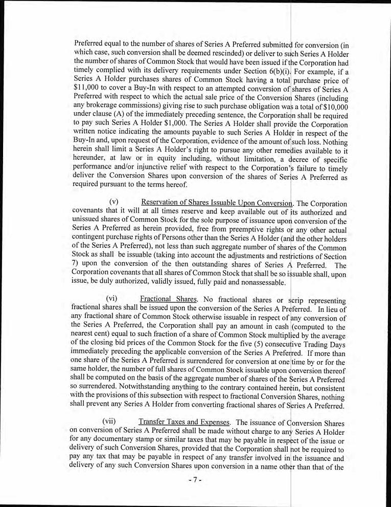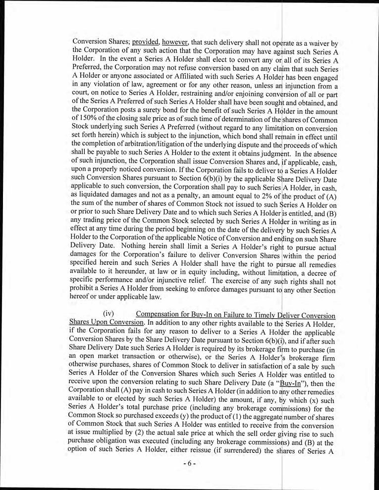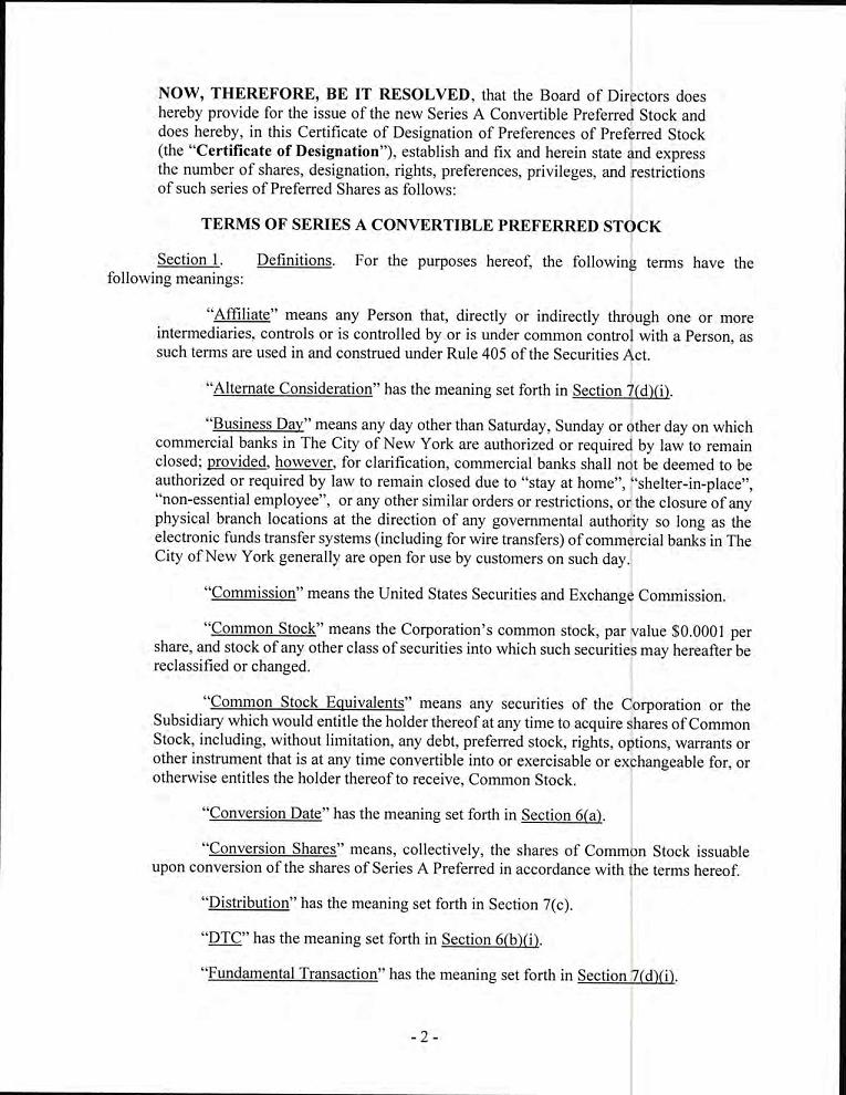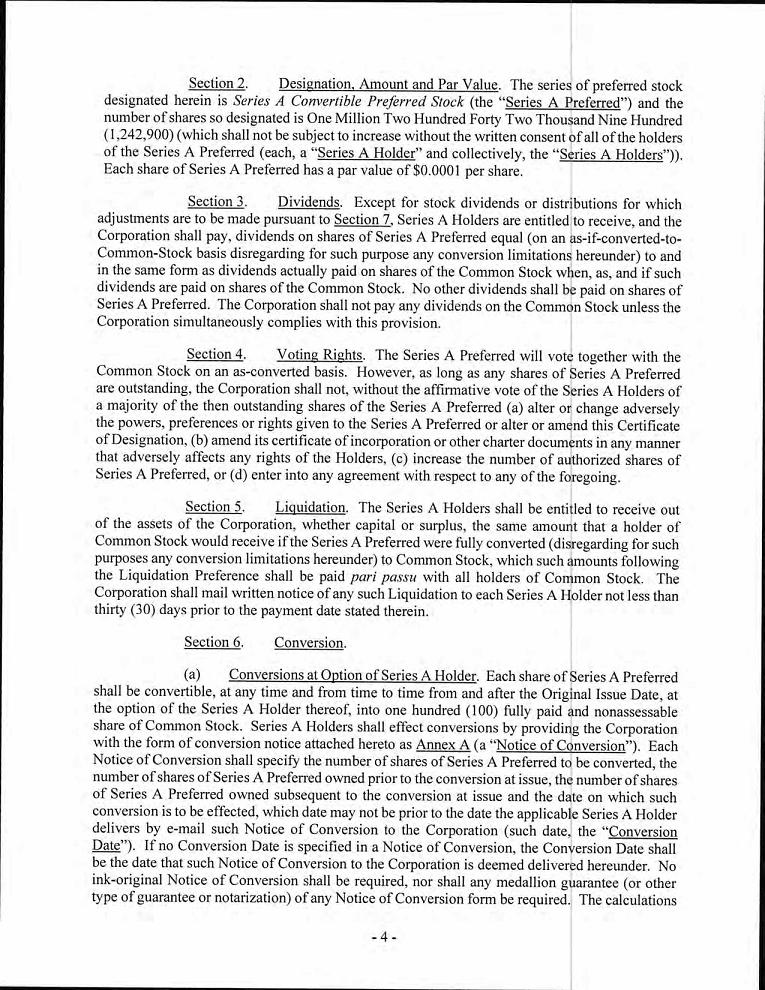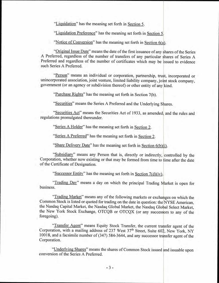| ● | On the Closing Date, the Company issued 552,000 shares of Series A Preferred Stock to the Sellers as a portion of the Purchase Price, with the remaining 60,000 shares of Series A Preferred Stock to be held in escrow for the benefit of the Buyer to satisfy indemnification obligations of the Sellers. |