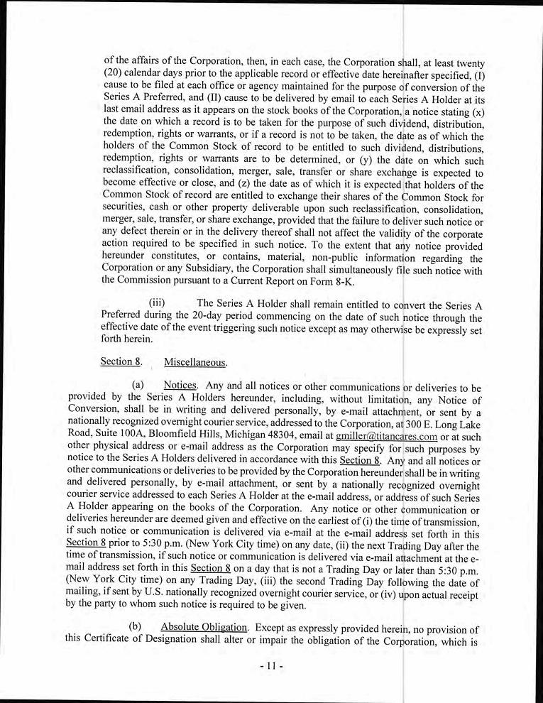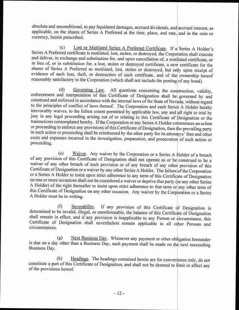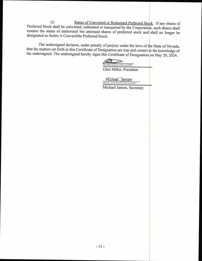 | ● | On May 20, 2024, the Company filed an Amended and Restated Certificate of Designation of the Preferences of Series A Convertible Preferred Stock (as amended, the “Series A COD”) with the Secretary of State of the State of Nevada, pursuant to which the number of shares designated as Series A Convertible Preferred Stock (“Series A Preferred Stock”) were increased from 630,900 shares to 1,242,900 shares. The rights related to the Series A Preferred Stock remain virtually identical to the rights related to the Company’s Common Stock, except that each share of Series A Preferred Stock is convertible into 100 shares of Common Stock and the shares of Series A Preferred Stock vote together with the Common Stock on all matters submitted for a vote to the Company’s common shareholders on an as-converted basis. | |