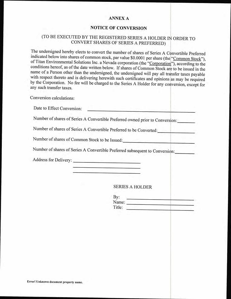 “Investment Shares” means $2,610,000 worth of TESI Preferred Stock to be represented by 522,000 shares of the TESI Preferred Stock, and 90,000 shares of the TESI Preferred Stock for the Extension Consideration. The number of shares of the TESI Preferred Stock shall be subject to adjustment for stock splits, stock combinations, conversion ratios and the like. The parties agree that the additional Preferred Stock shall satisfy the Extension Consideration referenced in the Agreement. For avoidance of doubt, 522,000 shares of TESI Preferred Stock shall convert into 52,200,000 shares of TESI Common Stock and 90,000 shares of TESI Preferred Stock shall convert into 9,000,000 shares of TESI Common Stock.