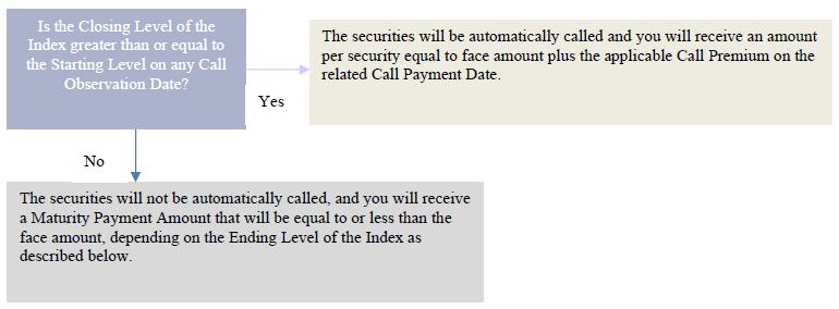 If the Closing Level of the Index on any Call Observation Date (including the Final Calculation Day) is greater than or equal to the Starting Level, the securities will be automatically called, and on the related Call Payment Date you will be entitled to receive a cash payment per security in U.S. dollars equal to the face amount plus the Call Premium applicable to the relevant Call Observation Date. The last Call Observation Date is the Final Calculation Day, and payment upon an automatic call on the Final Calculation Day, if applicable, will be made on the Stated Maturity Date.