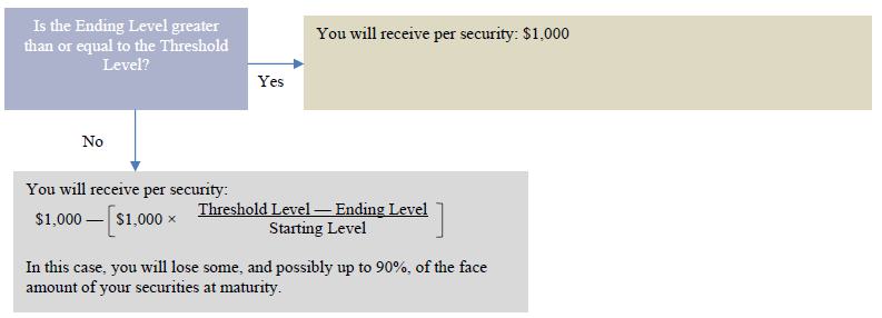 If the securities are not automatically called and the Ending Level is less than the Threshold Level, you will have 1-to-1 downside exposure to the decrease in the level of the Index in excess of 10% and will lose some, and possibly up to 90%, of the face amount of your securities at maturity.