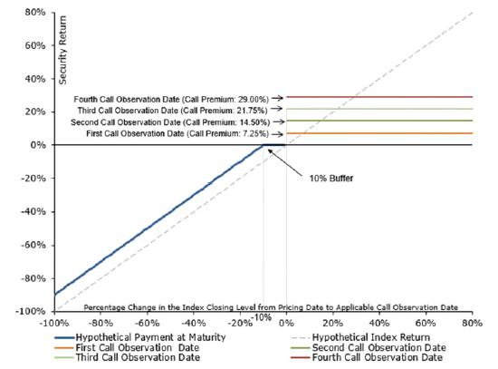 | Hypothetical Call Premiums: | 7.25% for the first Call Observation Date, 14.50% for the second Call Observation Date, 21.75% for the third Call Observation Date and 29.00% for the fourth Call Observation Date (assuming that a Call Premium is equal to the lowest possible Call Premium that will be determined on the Pricing Date) |