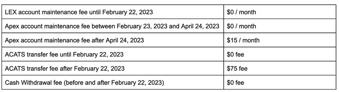 If you are still holding an account at Apex after April 25, 2023 (60 days following February 22, 2023), Apex will begin charging a $15/month account maintenance fee.