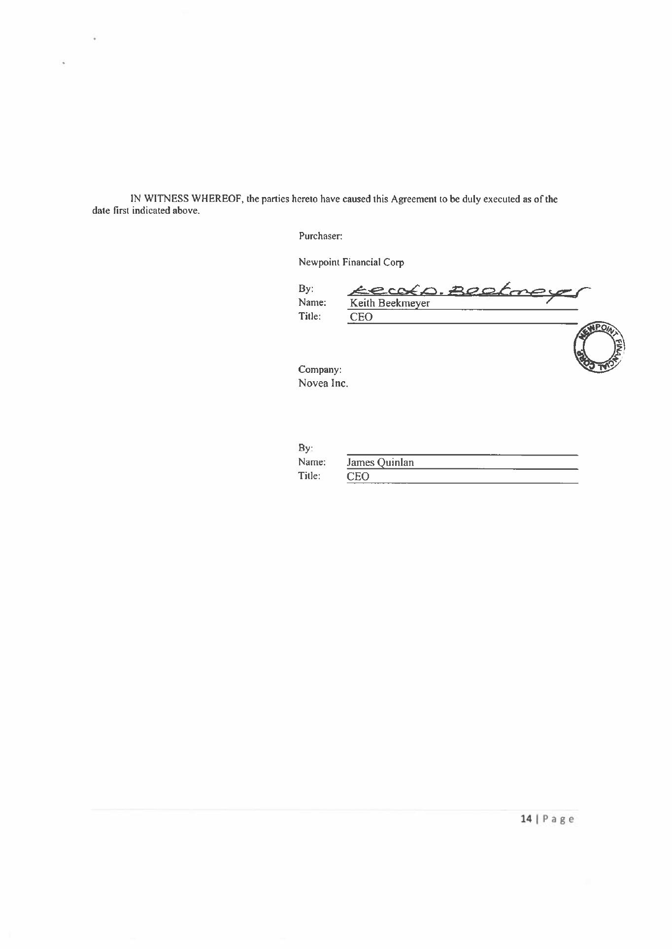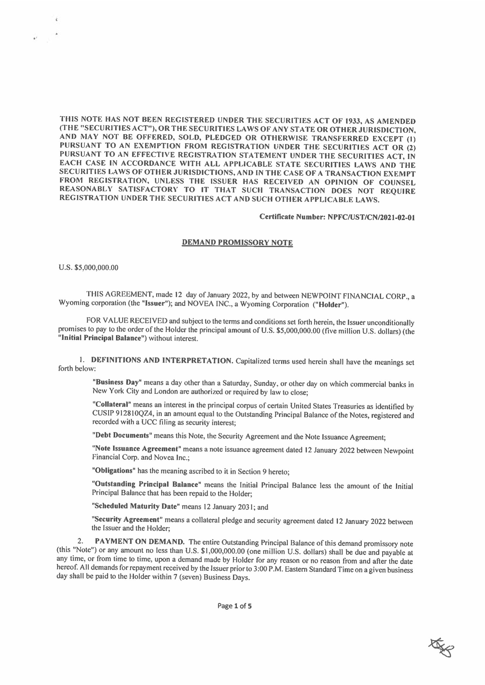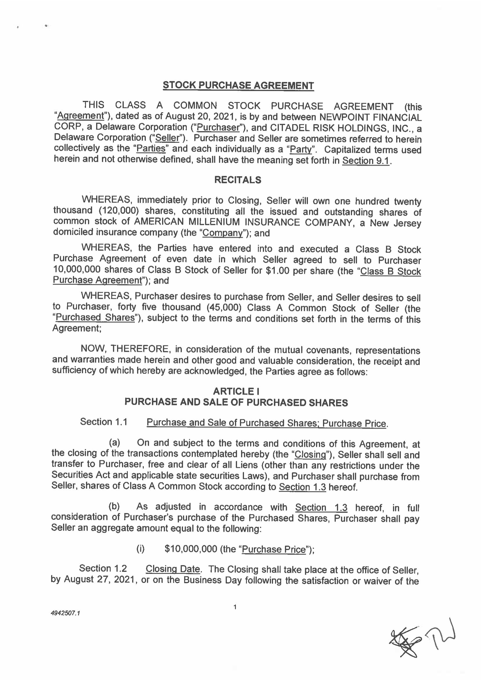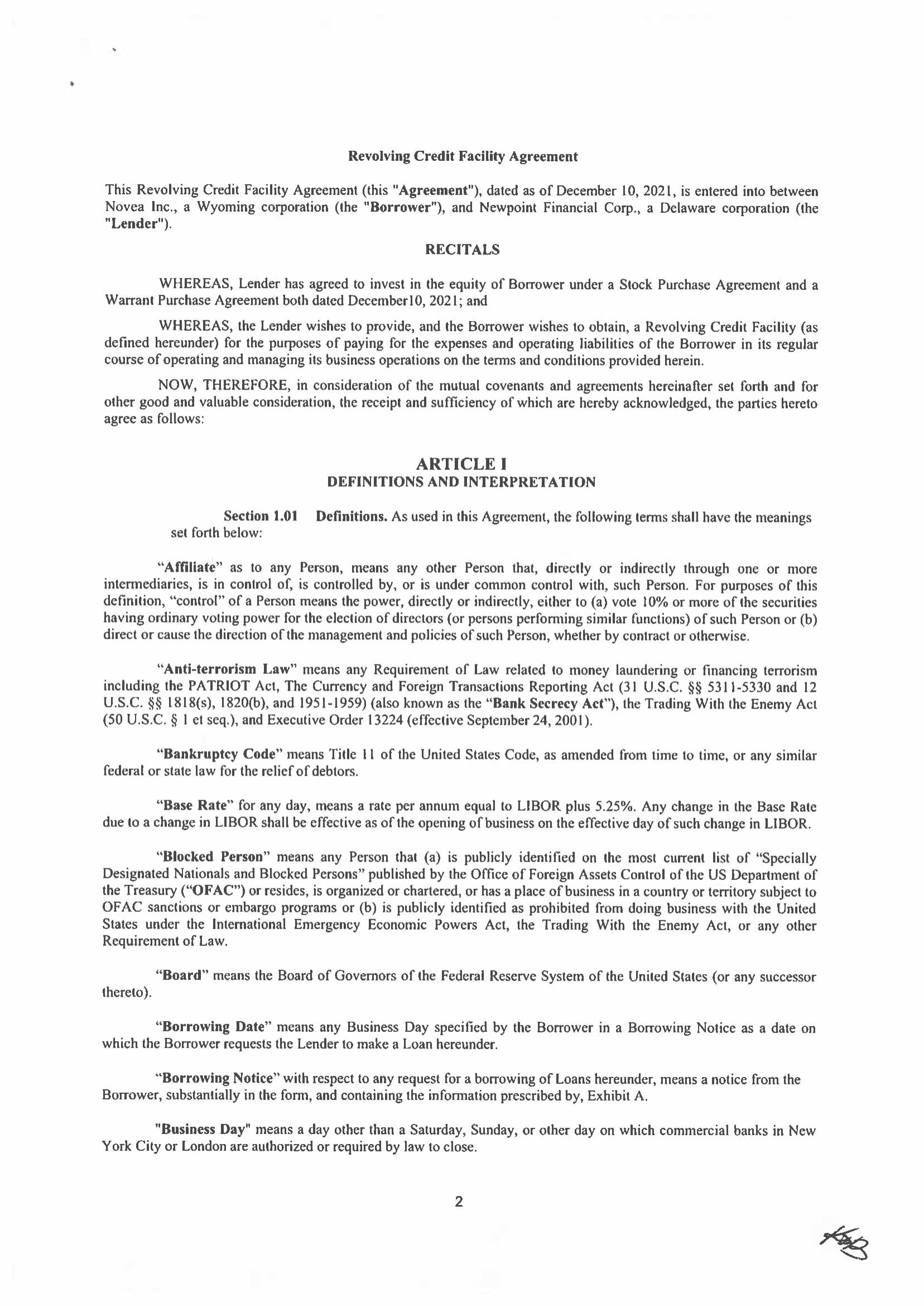 Newpoint Financial Corp., a Delaware corporation (the “Company,” “we,” “us,” or “our”) is a holding company that strategically invests primarily in regulated entities such as banks and insurance companies. These investments may be result in us acquiring a controlling or non-controlling interests of these entities. To date, we have entered into three such transactions (one of which has closed): in December 2021 we acquired a 10% interest in Novea, Inc., a financial and insurance services software company; we have also entered into an agreement for the acquisition of an interest in American Millennium Insurance Co., a New Jersey based insurance company (see Item 9b) through purchase of shares of its parent holding companies. Closing is subject to receipt of regulatory approvals and other customary closing conditions.