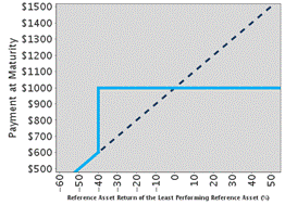 If the Notes are not redeemed prior to scheduled maturity, and if you hold the Notes to maturity, you will receive on the Maturity Date a cash payment per $1,000 principal amount of notes (in addition to any Contingent Coupon that may be payable on such date) equal to: · If the Final Value of the Least Performing Reference Asset is greater than or equal to its Barrier Value, $1,000 per $1,000 principal amount note · If the Final Value of the Least Performing Reference Asset is less than its Barrier Value, an amount calculated as follows: $1,000 + [$1,000 × Reference Asset Return of the Least Performing Reference Asset] If the Final Value of the Least Performing Reference Asset is less than its Barrier Value, you will be fully exposed to the decline of the Least Performing Reference Asset from its Initial Value. You may lose up to 100.00% of the principal amount of your notes at maturity. |
